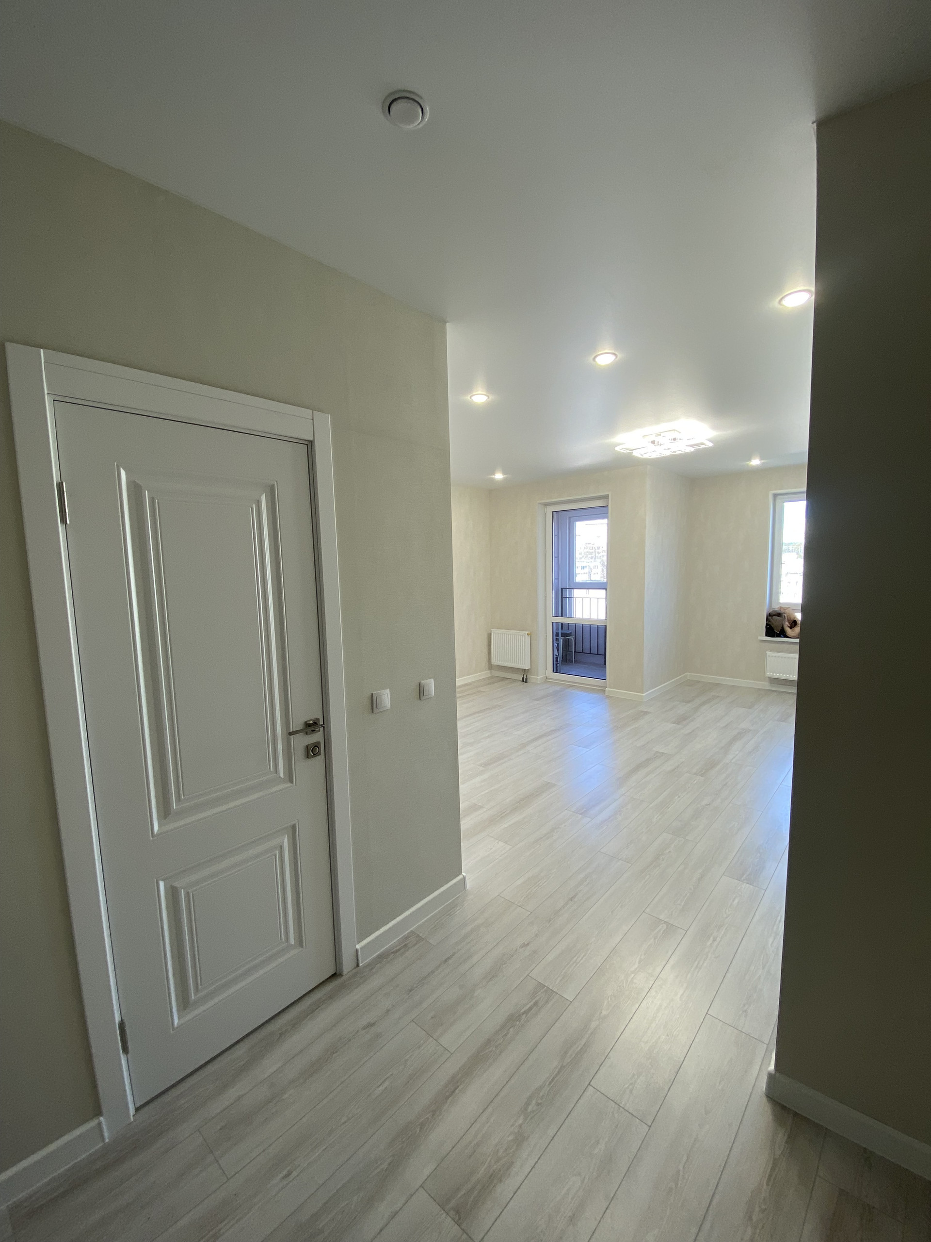 В квартире выполнен свежий ремонт в светлых тонах, что придает ей больше тепла и уюта. Стены выровнены, обои, натяжной поток, точечные светильники, люстра, электроразводка, розетки, выключатели, полы ламинат, м/к дверь. В санузле плитка керамогранит, вся сантехника, зеркало с подсветкой.