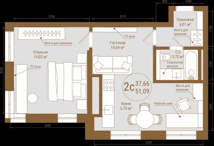 Просторная кухня-гостиная 24,34 кв.м, спальня 19,02 кв.м, с/у 3,72 кв.м., прихожая - 4,01 кв.м.