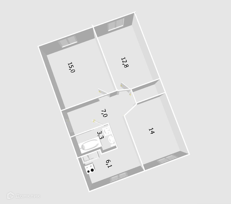 просторные три изолированные комнаты ( 15 м2, 12.8м2, 14 м2)