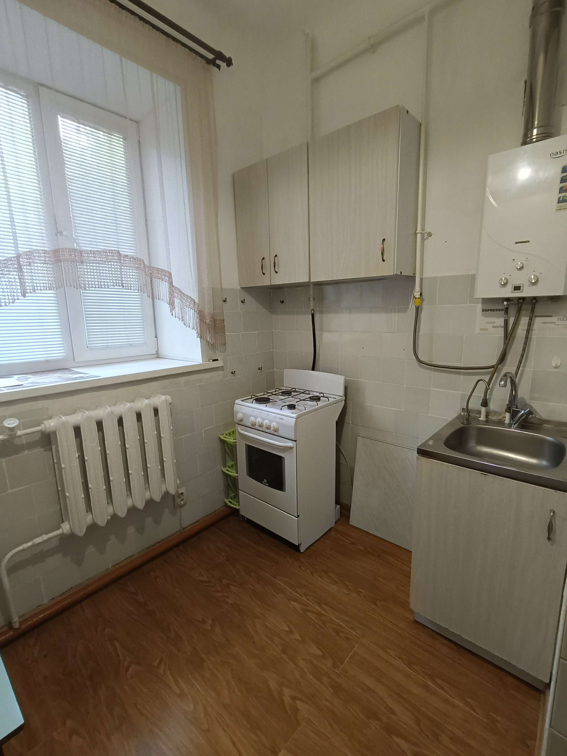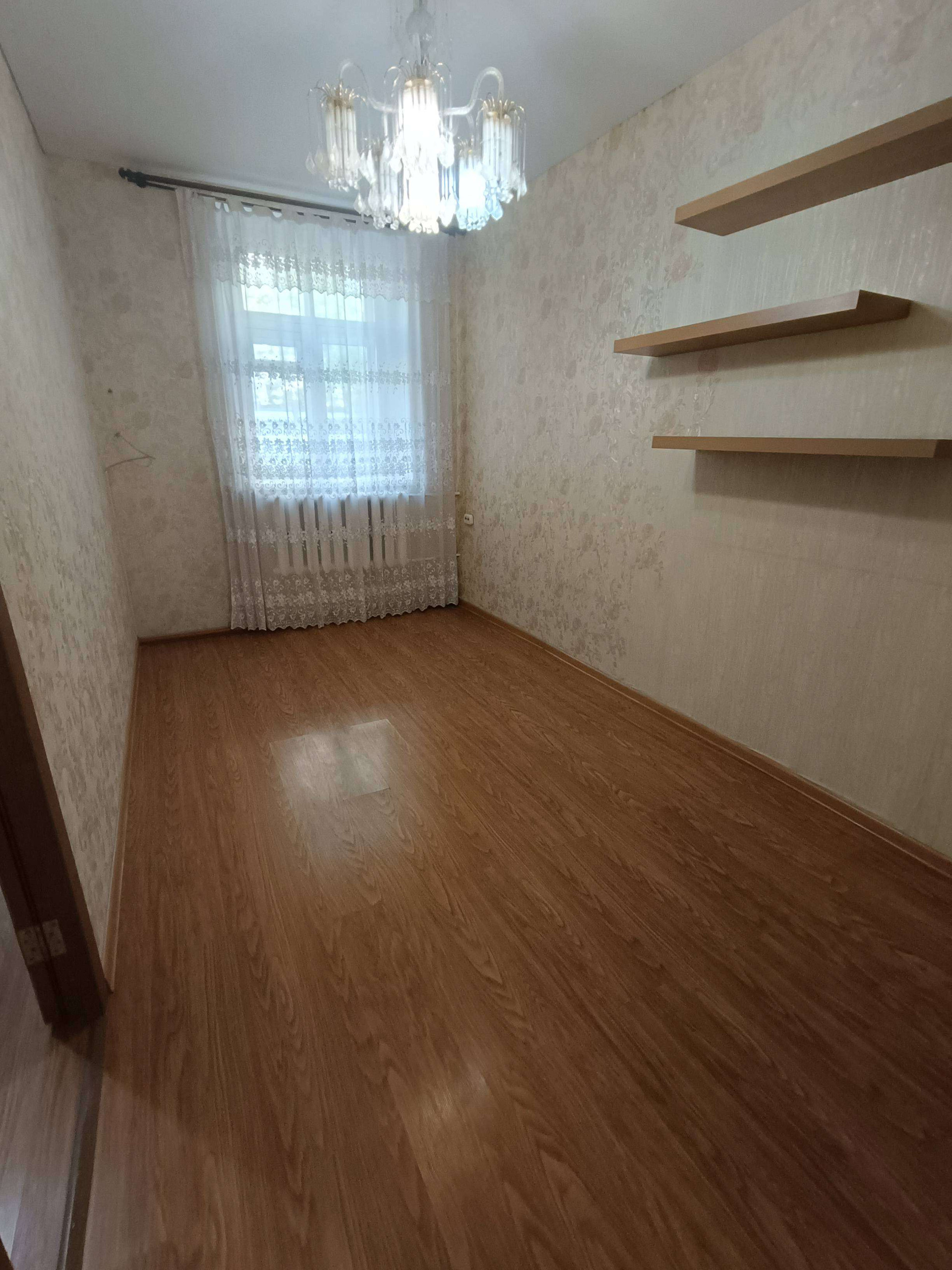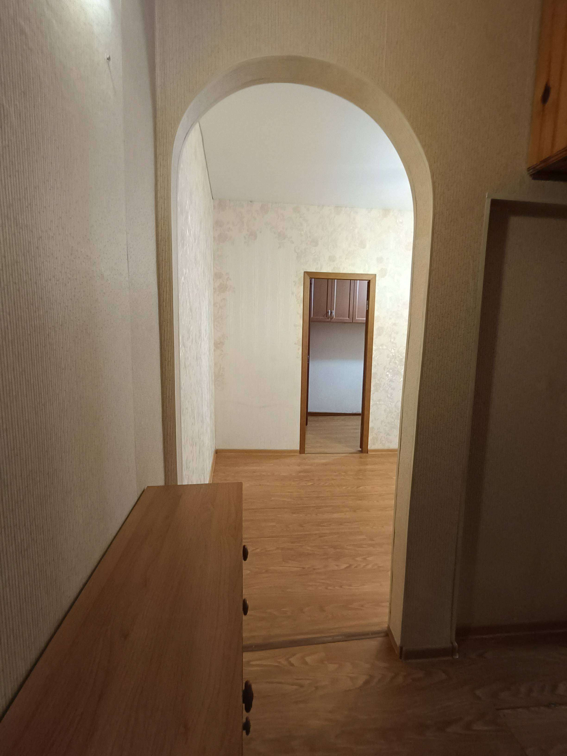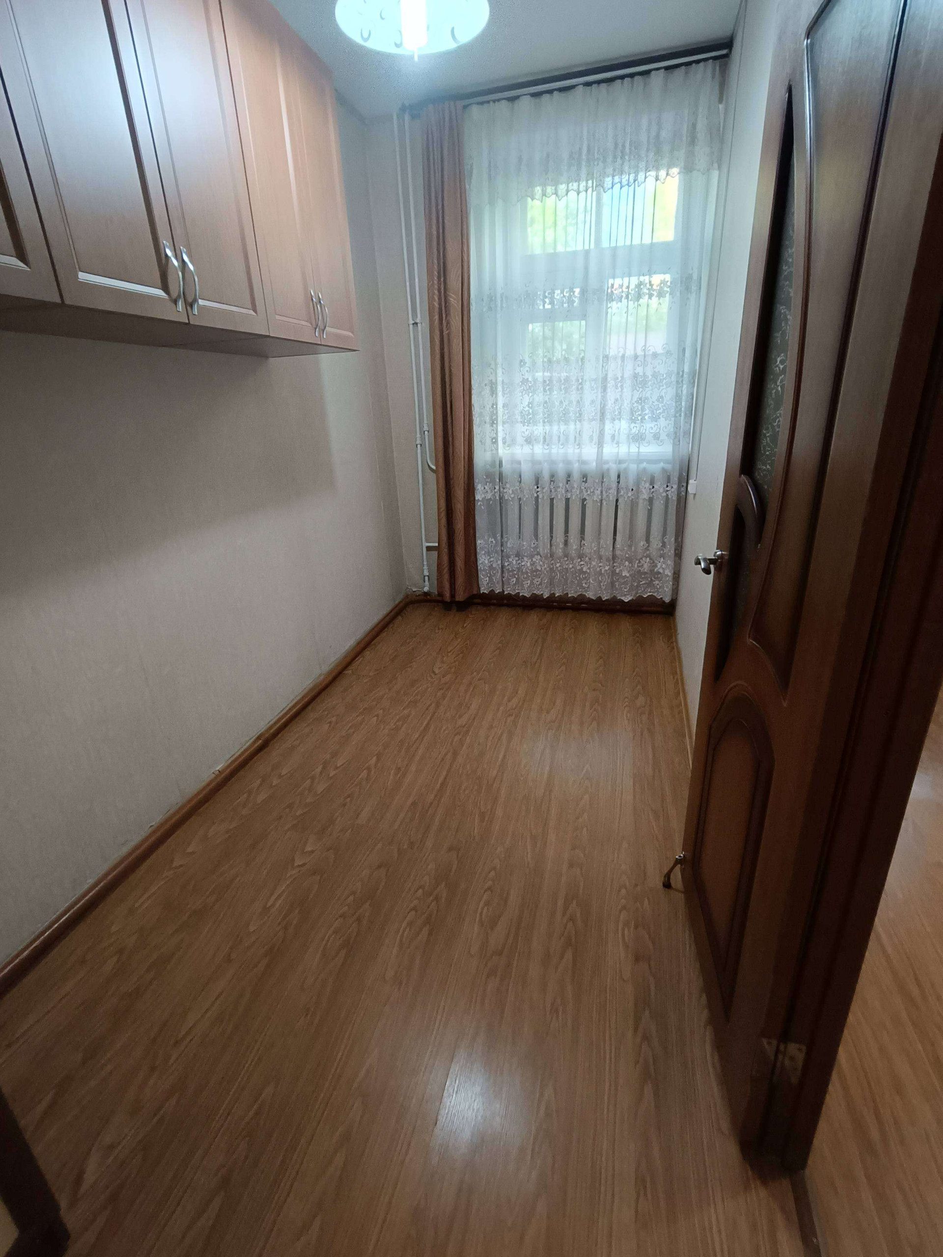Квартира чистая и уютная, сделан косметический ремонт, на полу ламинат. Дом кирпичный. Окна выходят во двор. Квартира однокомнатная, комната разделена на две перегородкой из гипсокартона.