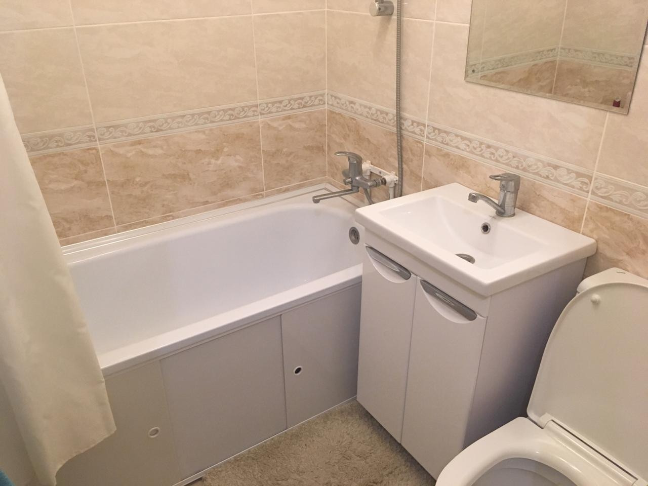 В ванной комнате-современная плитка на полу и стенах до потолка,новый унитаз,раковина ,ванна.