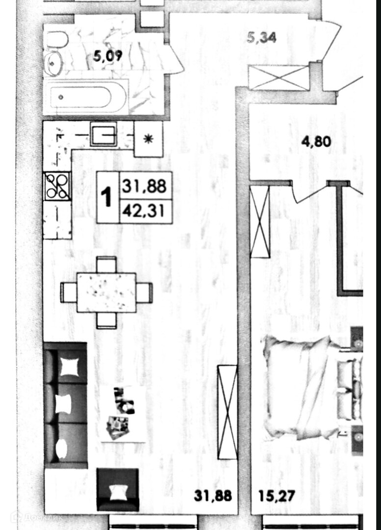 Общая площадь 42.4 м2