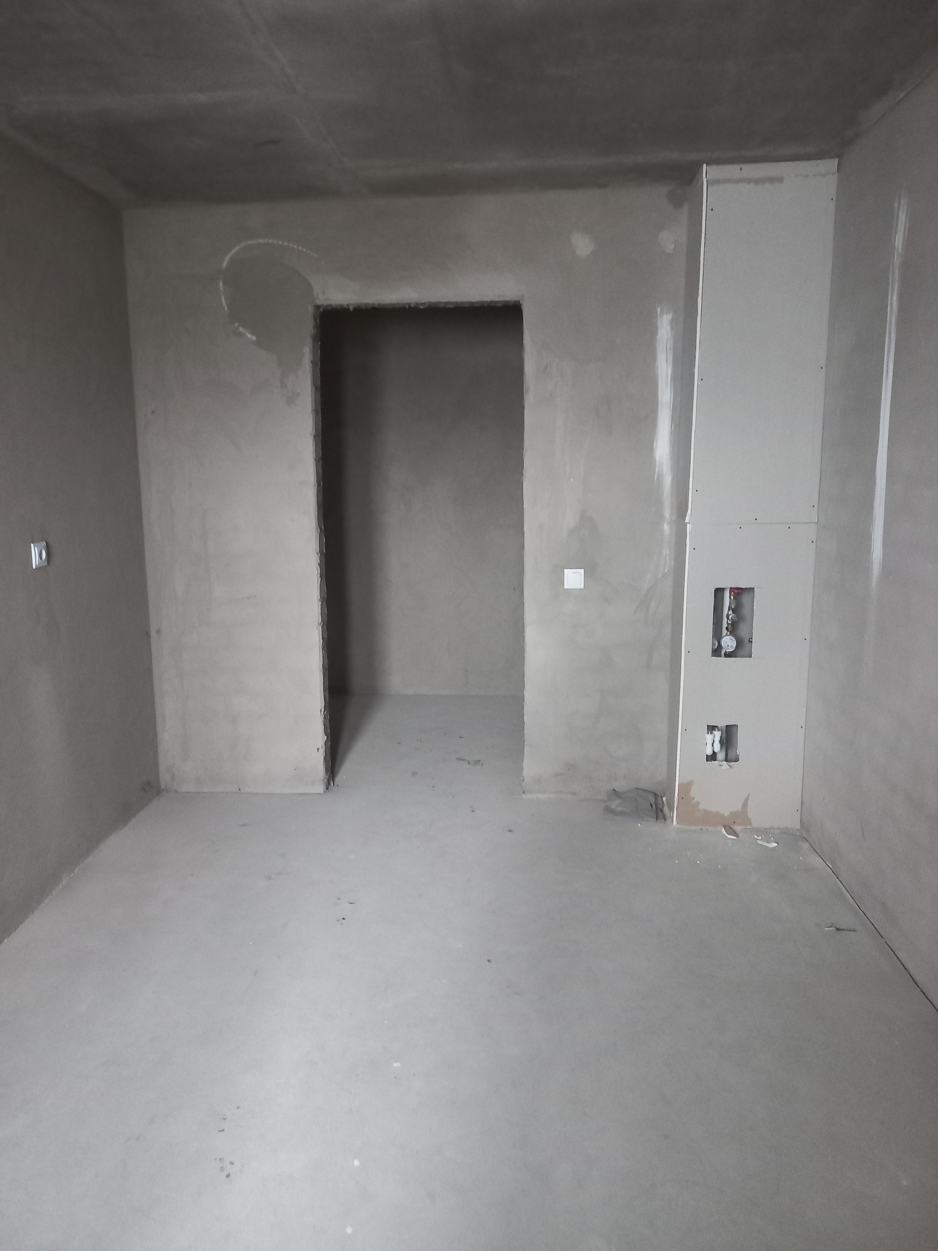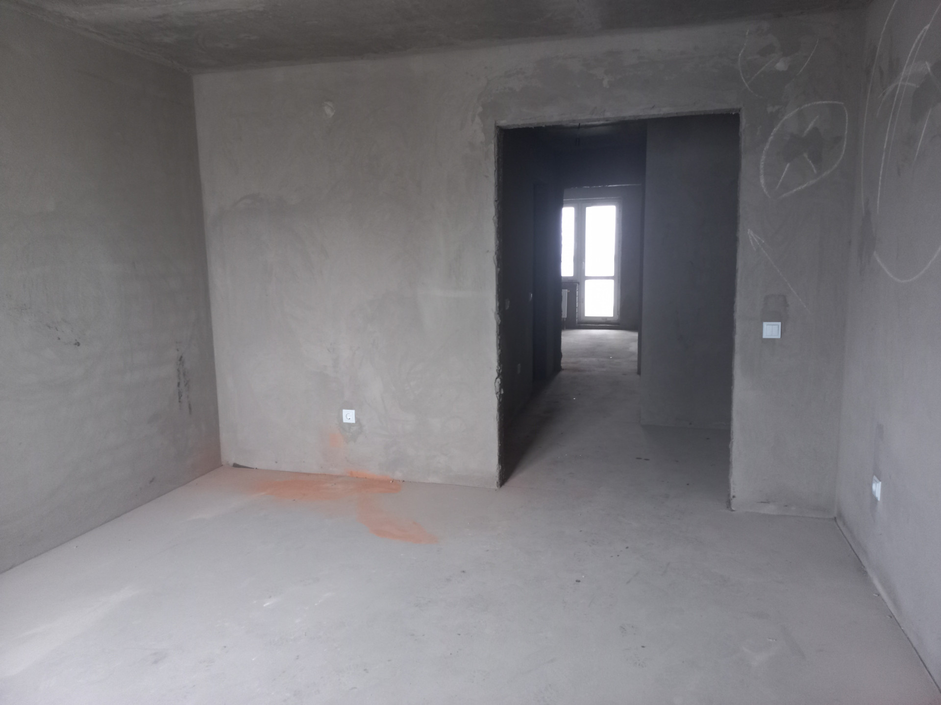 Предчистовая отделка - стяжка полов, электропроводка, водоснабжение, гидроизоляционное покрытие санузла, обе лоджии застекленены.