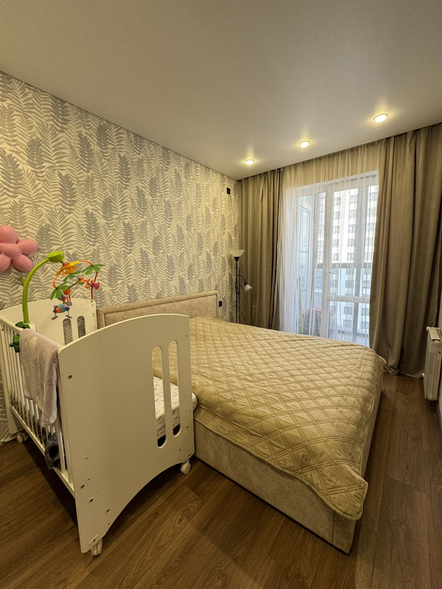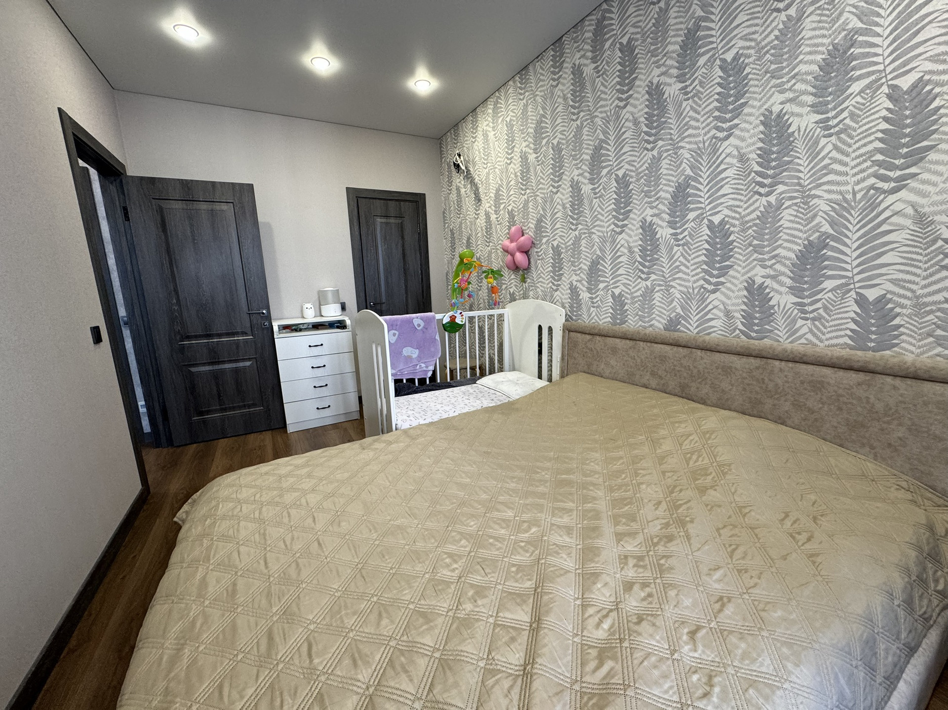 В квартире имеется мастер -спальня с оборудованной гардеробной комнатой, высота потолка 2.75, широкие оконные проемы, панорамная лоджия с выходом из спальной комнаты.