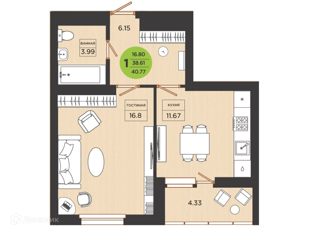 Общая площадь 40.8 м2