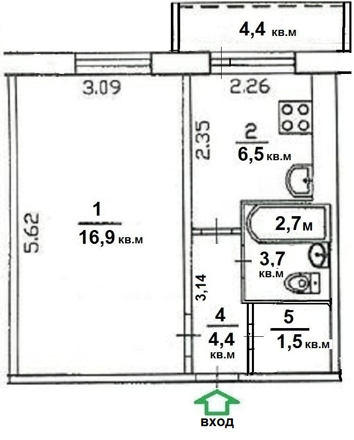 Балкон, лоджия 1 балкон
