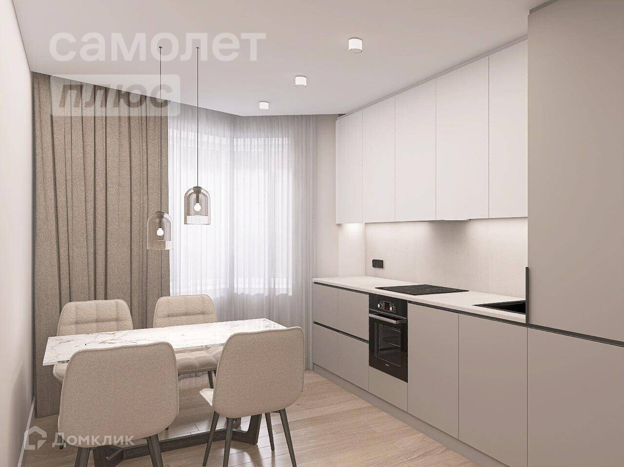 Кухня полностью укомплектована мебелью и встроенной техникой.