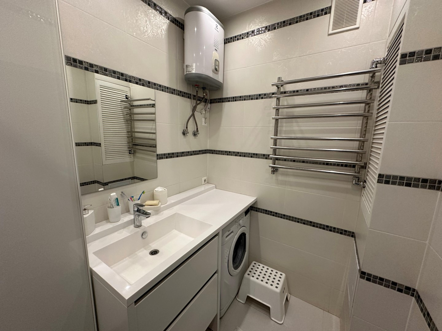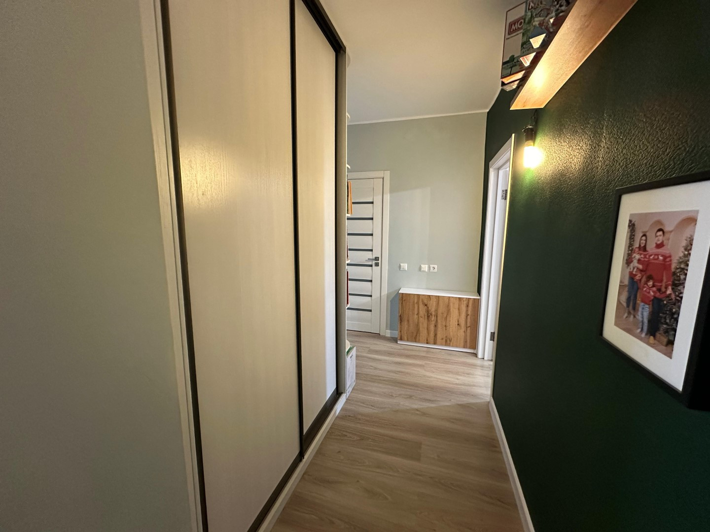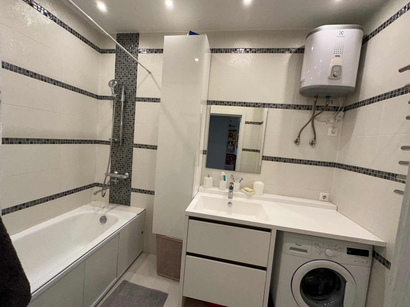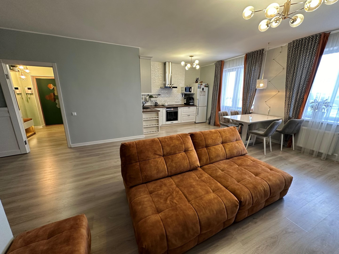 В квартире сделан очень качественный евро ремонт: на полу дорогой ламинат, стены окрашены-в комнатах, выровненные потолки со стильными светильниками, установлены современные межкомнатные двери и металлическая входная дверь с надежными замками, пластиковые премиальные стеклопакеты. Сан. узел отделан Испанской кафельной плиткой, в нем размещены стиральная машинка и водонагреватель, теплый электрический пол, кондиционер.