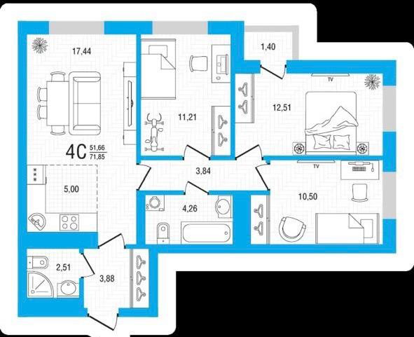 Oбщeй плoщадью 72,2 м кв с учетом бaлконa 1,4 м кв