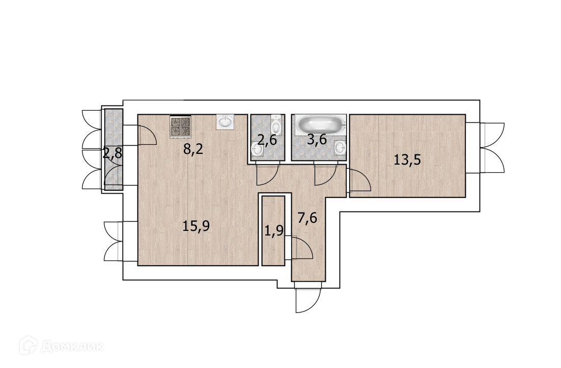 Общая площадь 53 м, с балконом 56 м, планировки "распашонка" с кухней-гостиной и отдельной спальней.