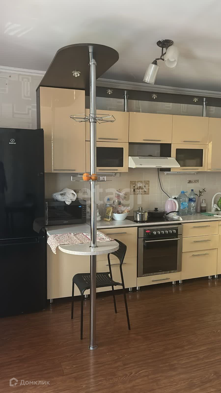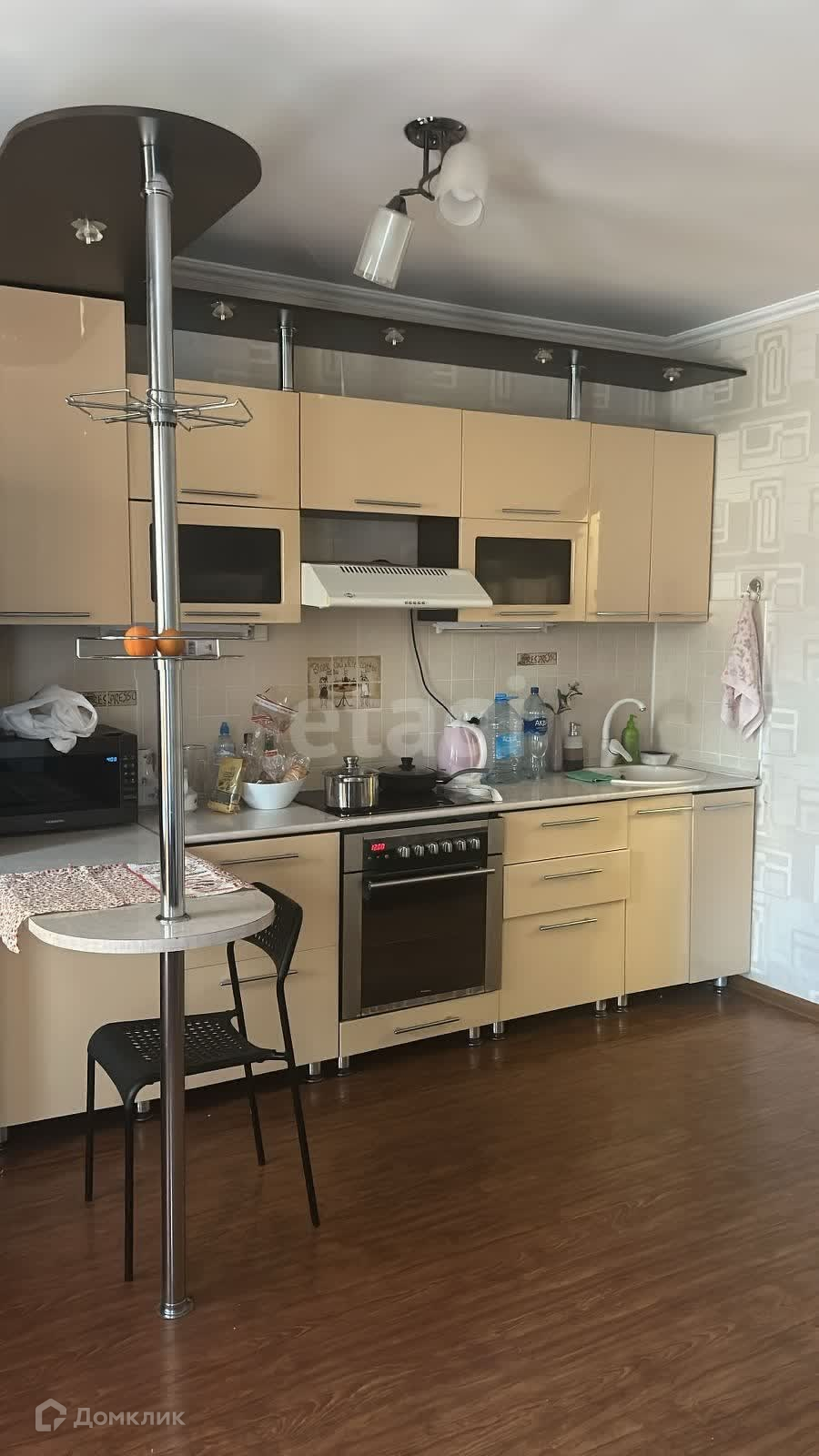 В квартире проведён отличный евроремонт. Остаётся телевизор, кровать, диван, шкафы в гардеробной, кухонный гарнитур и стол. Большая часть мебели в одном стиле.