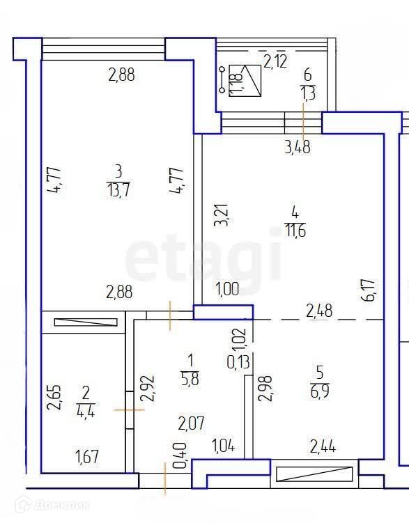 Общая площадь 42.4 м2