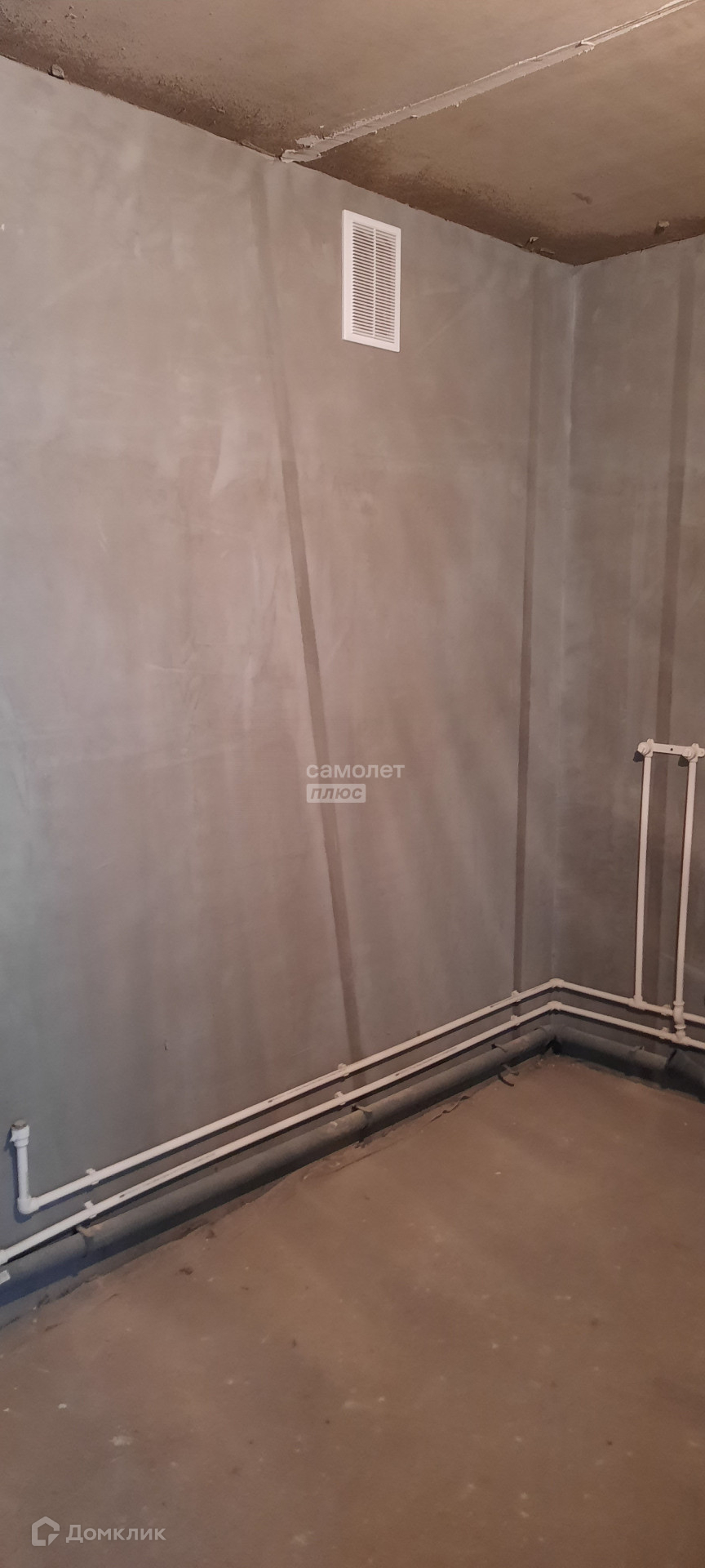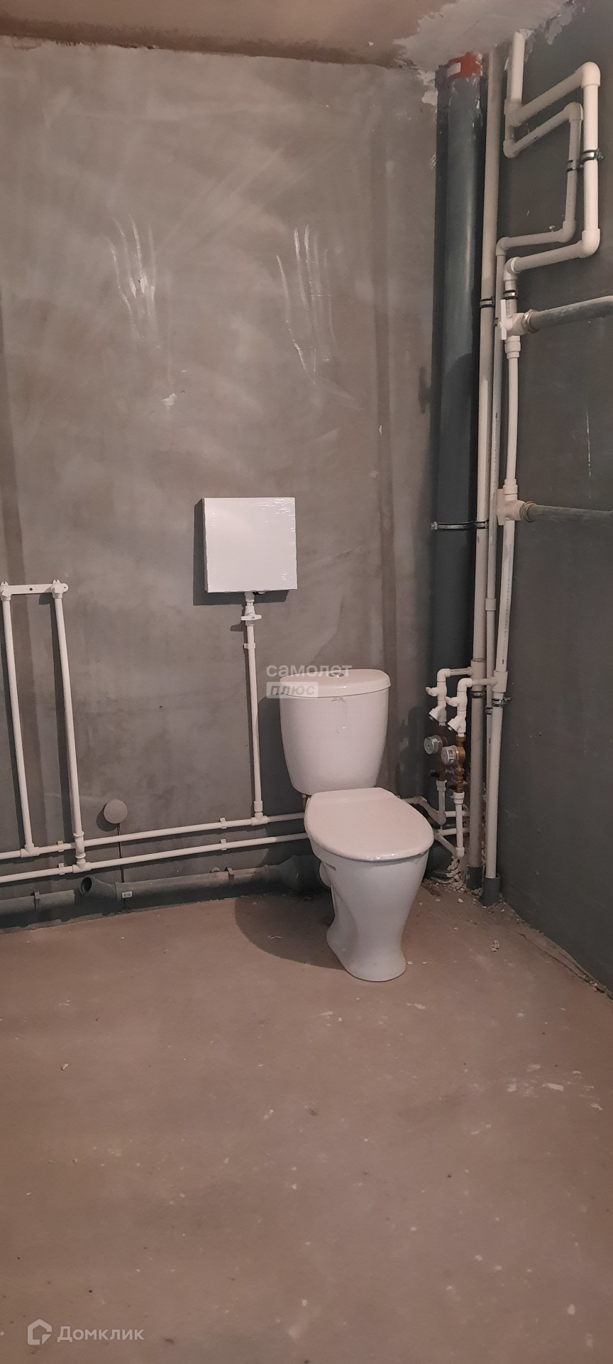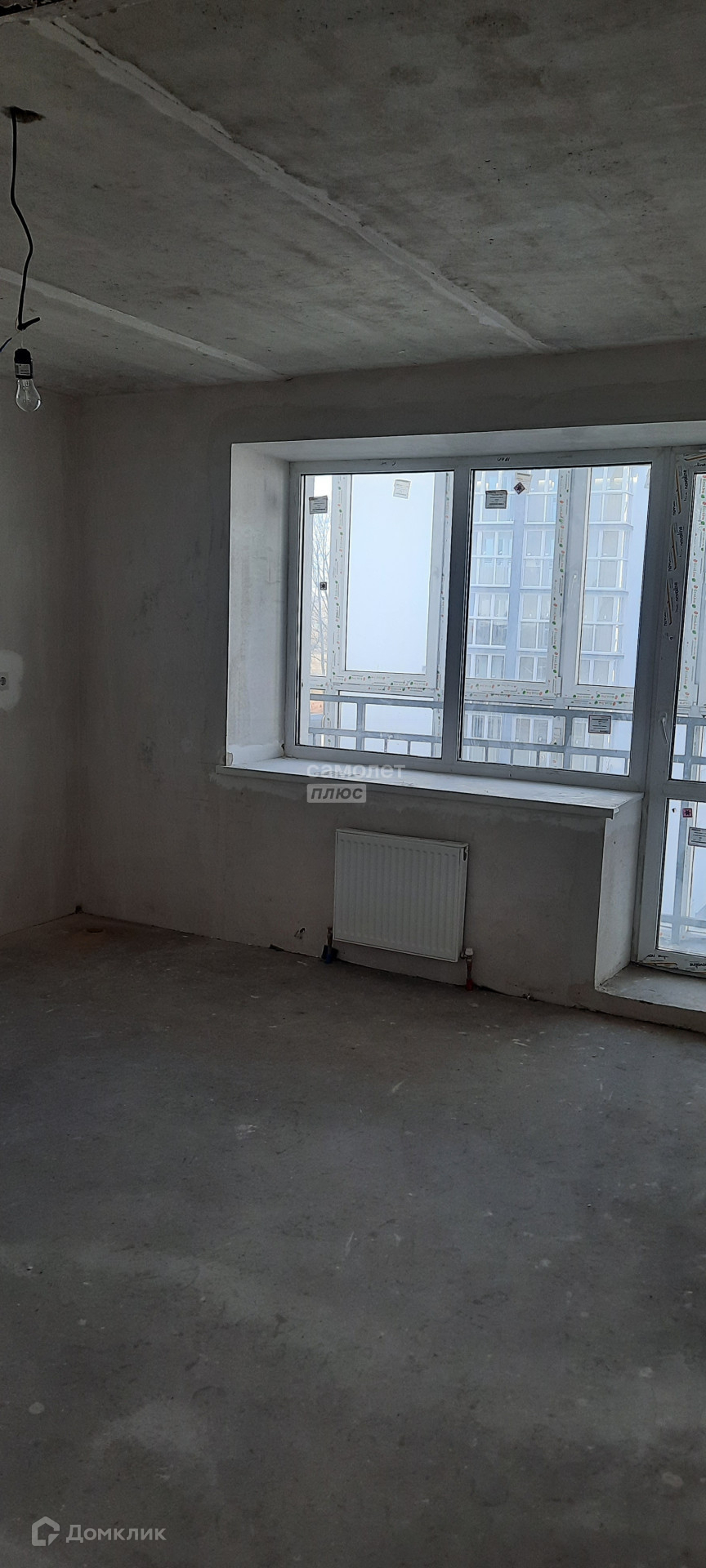 Квартира в предчистовой отделке: стяжка пола, штукатурка стен, радиаторы отопления, счетчики воды и электричества.
