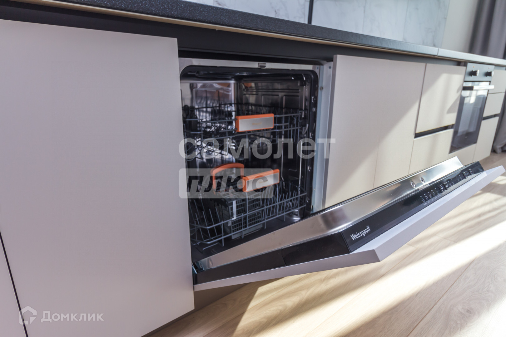 Стильный кухонный гарнитур со встроенной техникой (духовой шкаф, варочная панель, вытяжка, посудомоечная машина бренда «Weissgauff»)