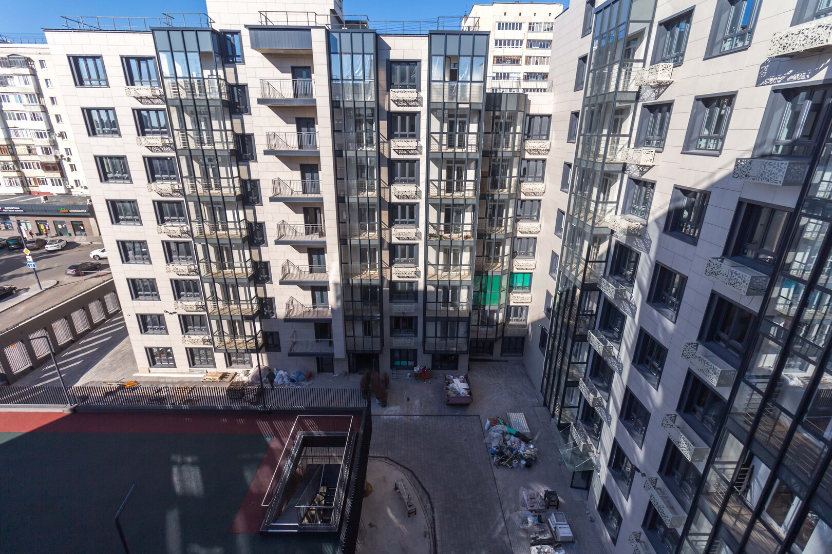 ✅ Двухуровневая детская площадка во внутреннем дворе со спортивными снарядами и развивающими играми.