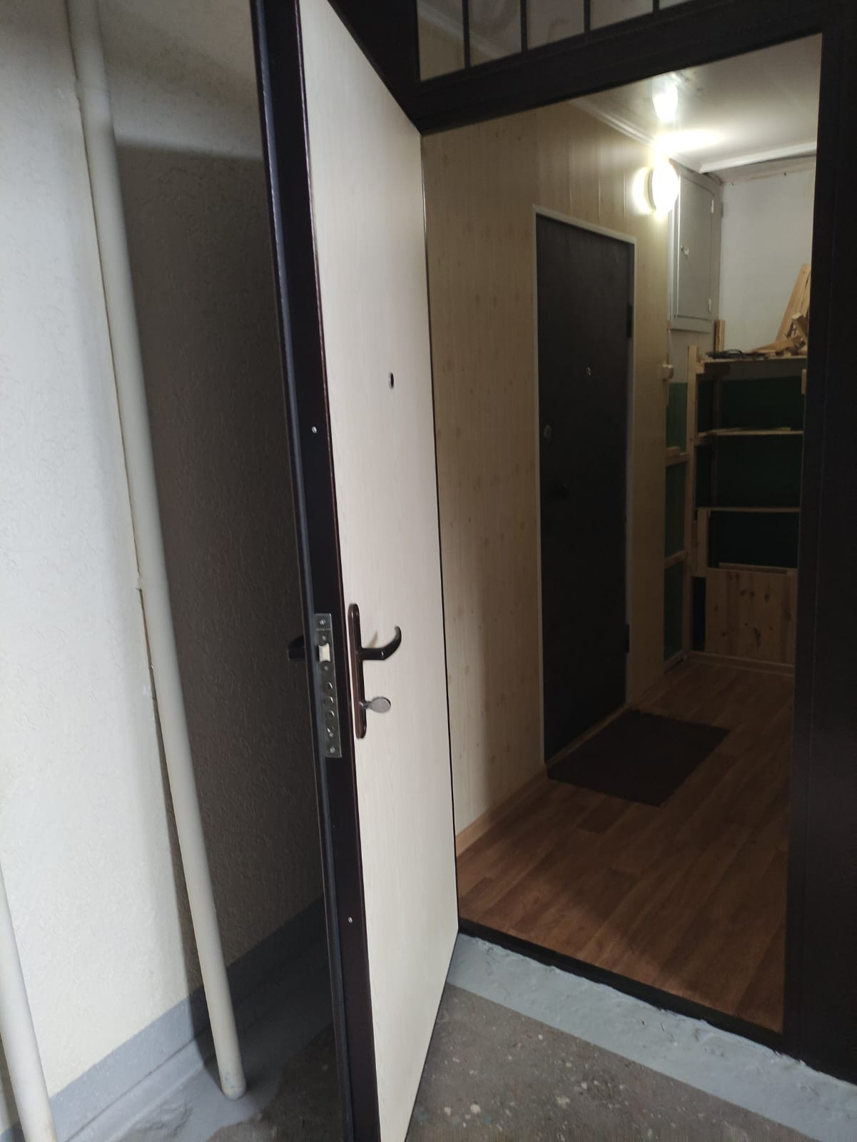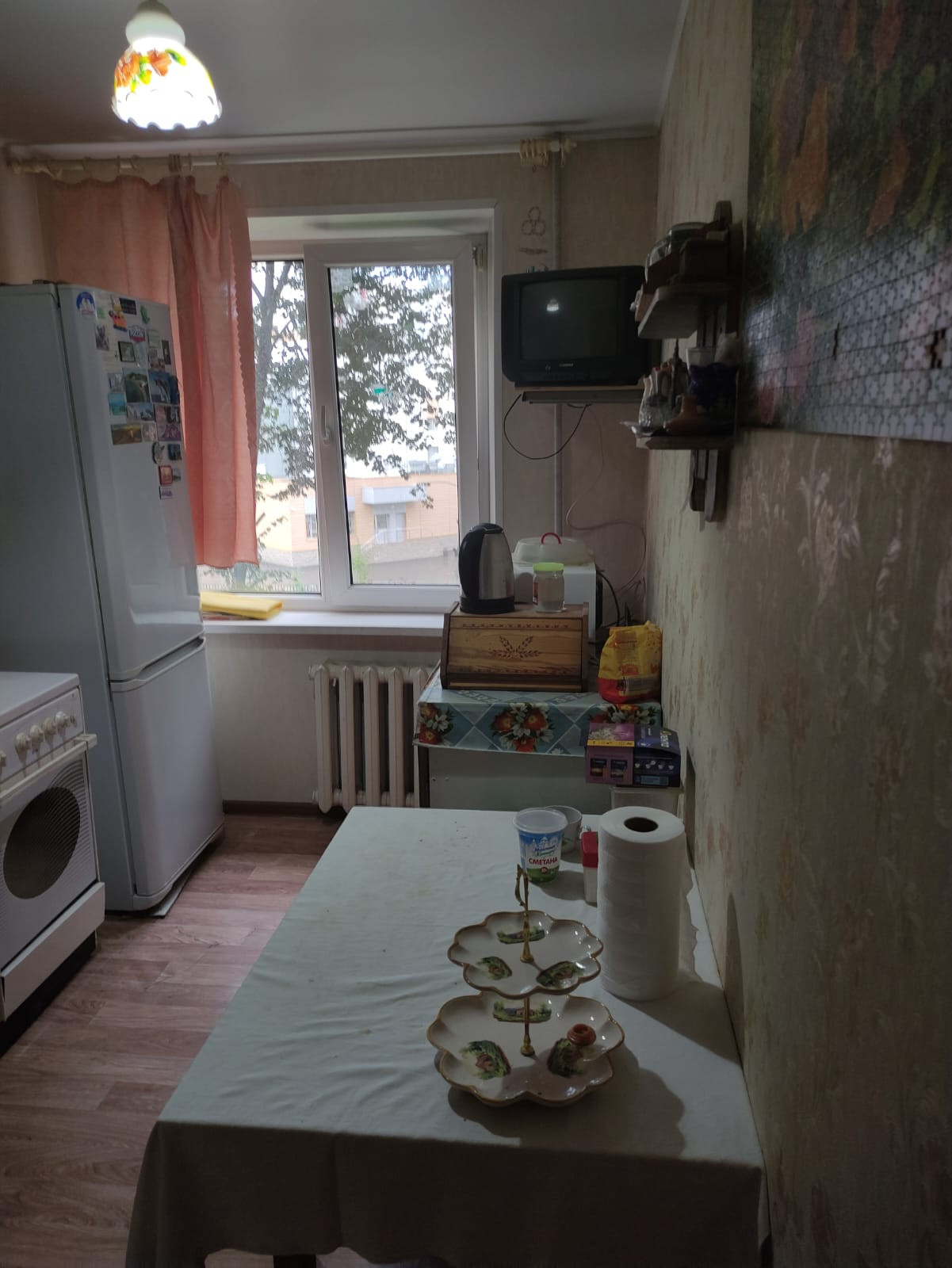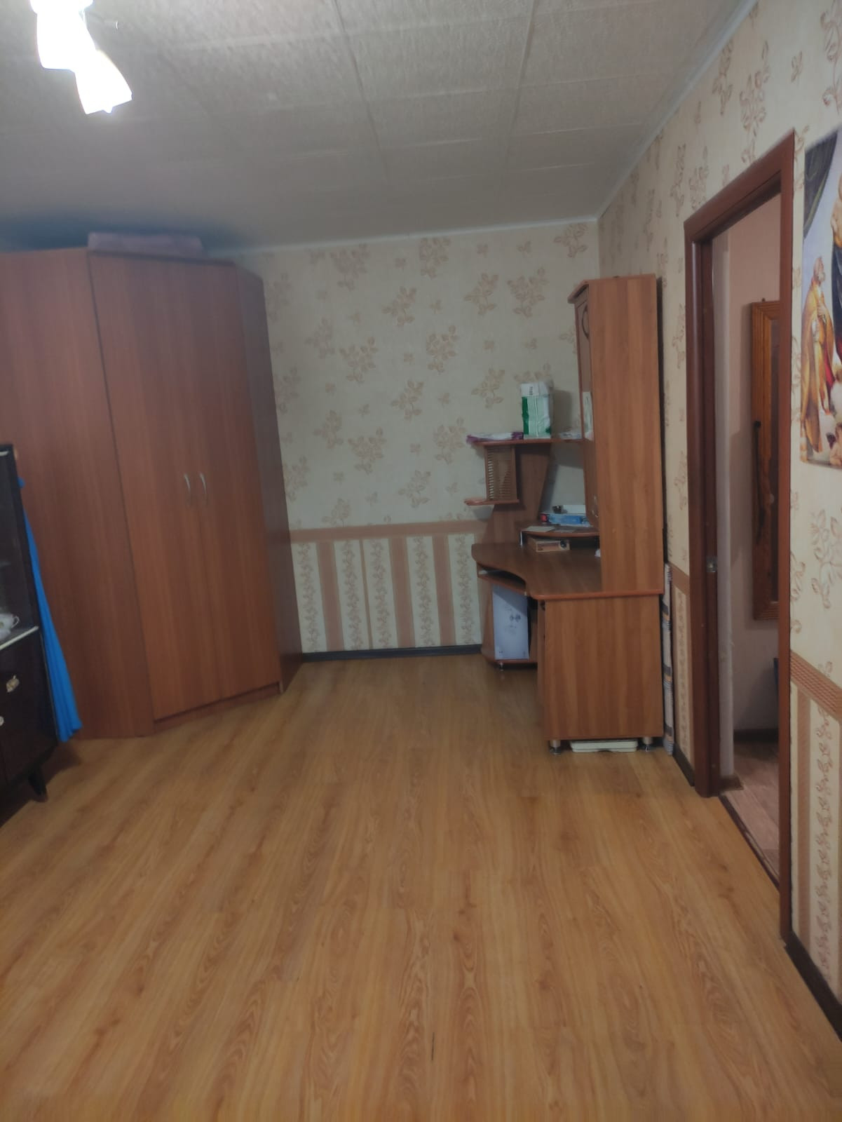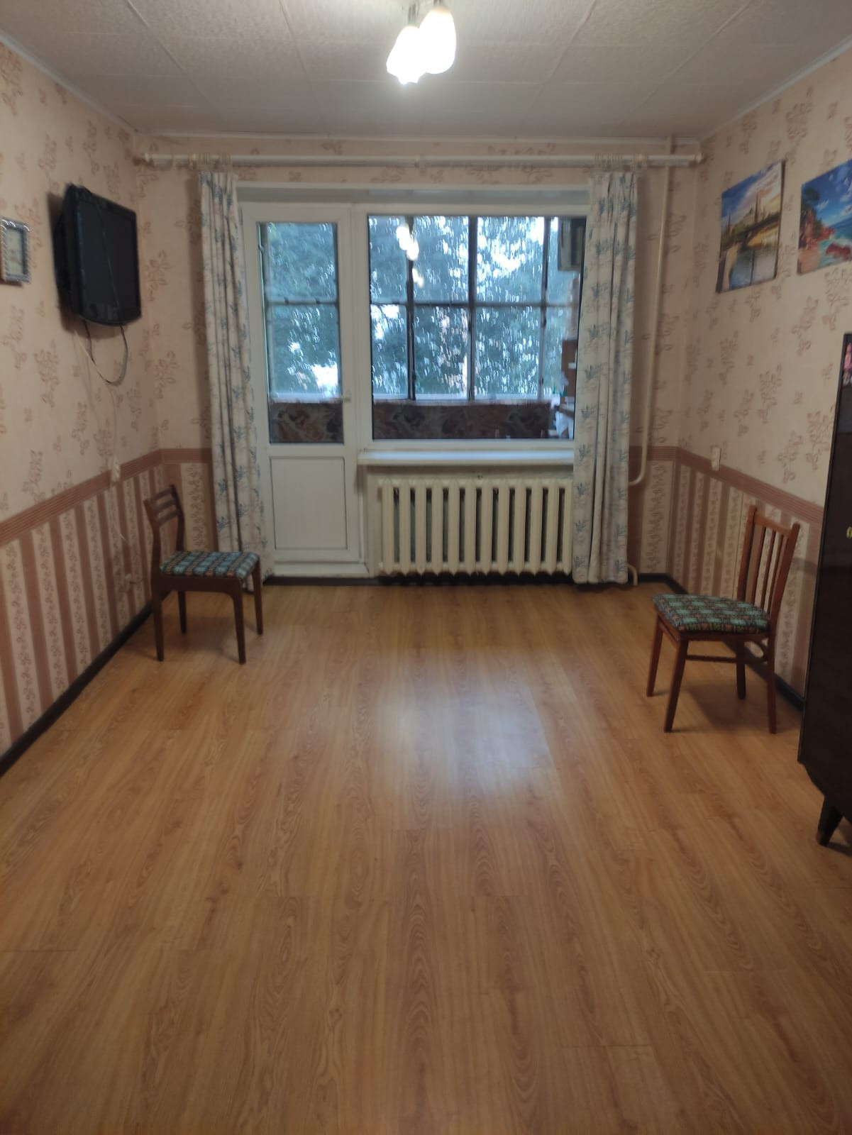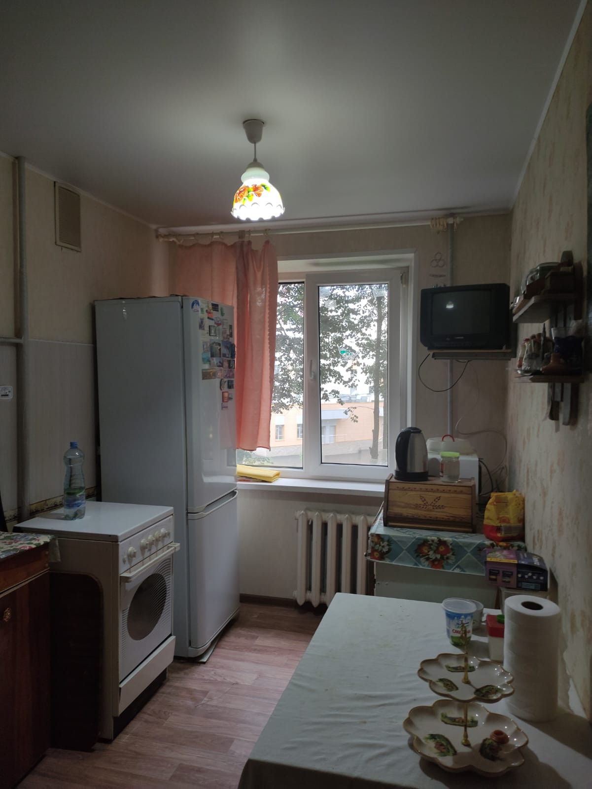 Пластиковые окна, натяжной потолок на кухне и коридоре, ламинат в комнатах, линолеум в остальных местах. Окна выходят за дом, где находятся д/с и школа.