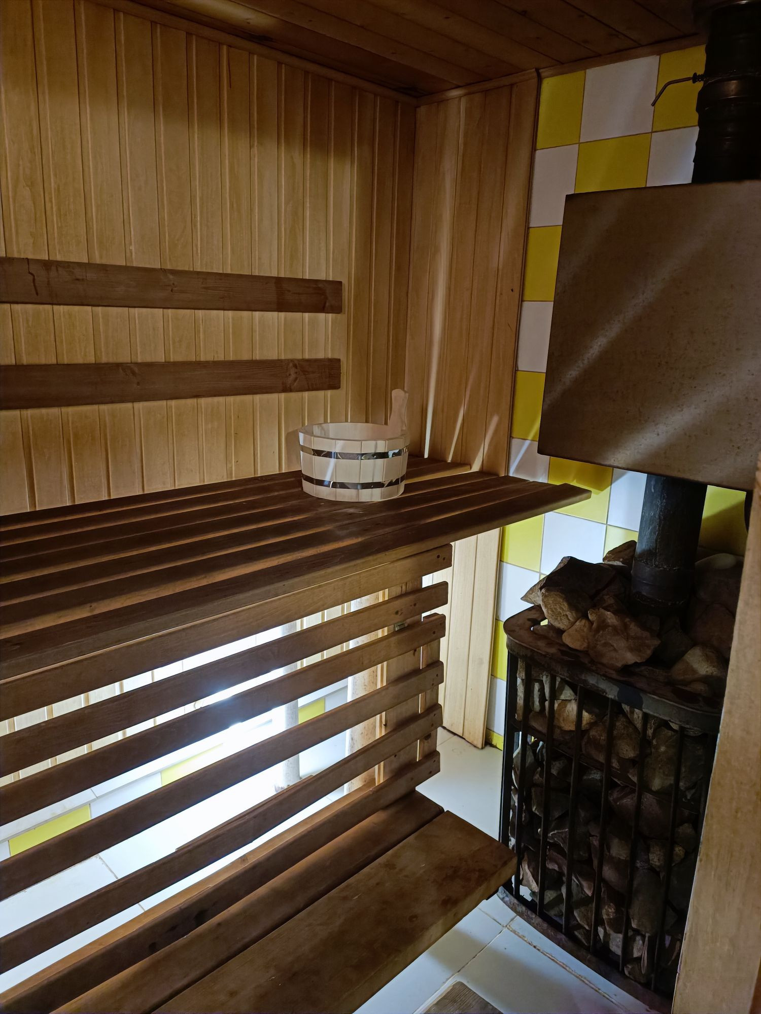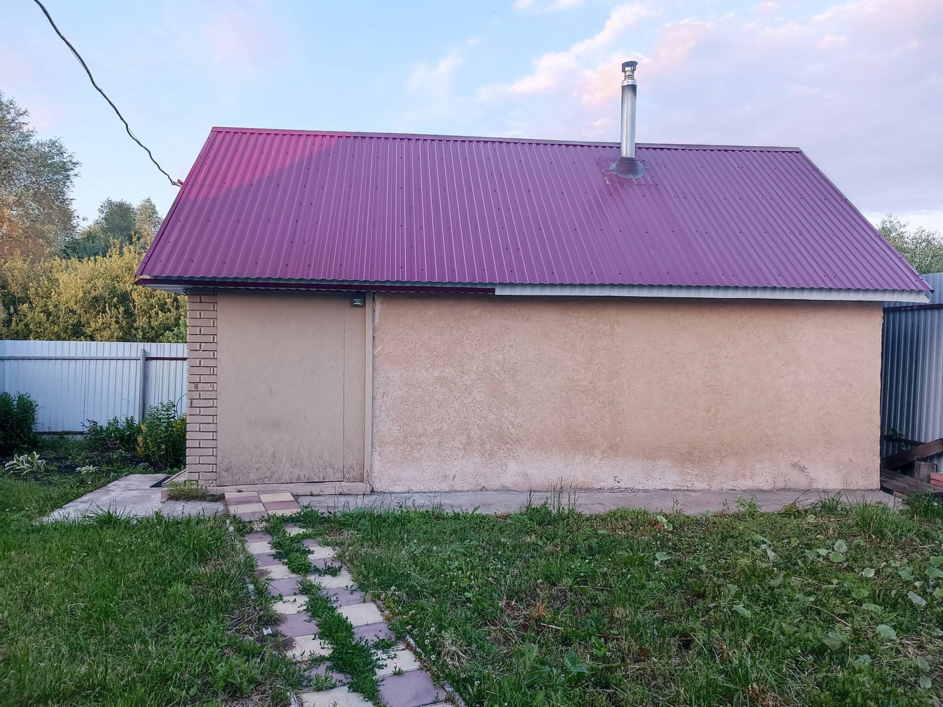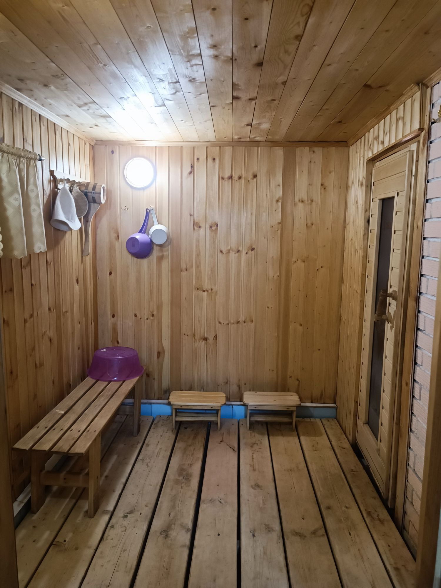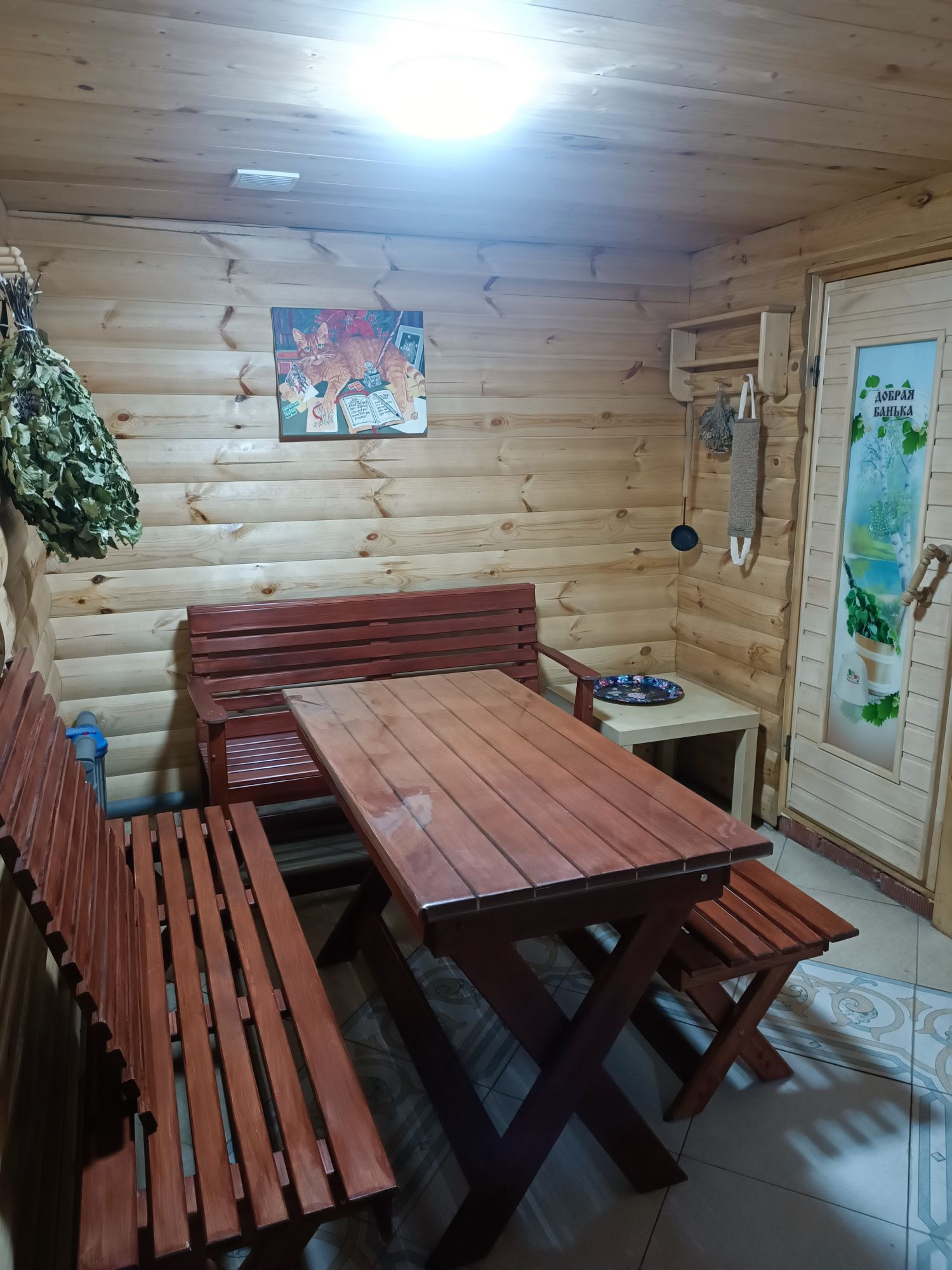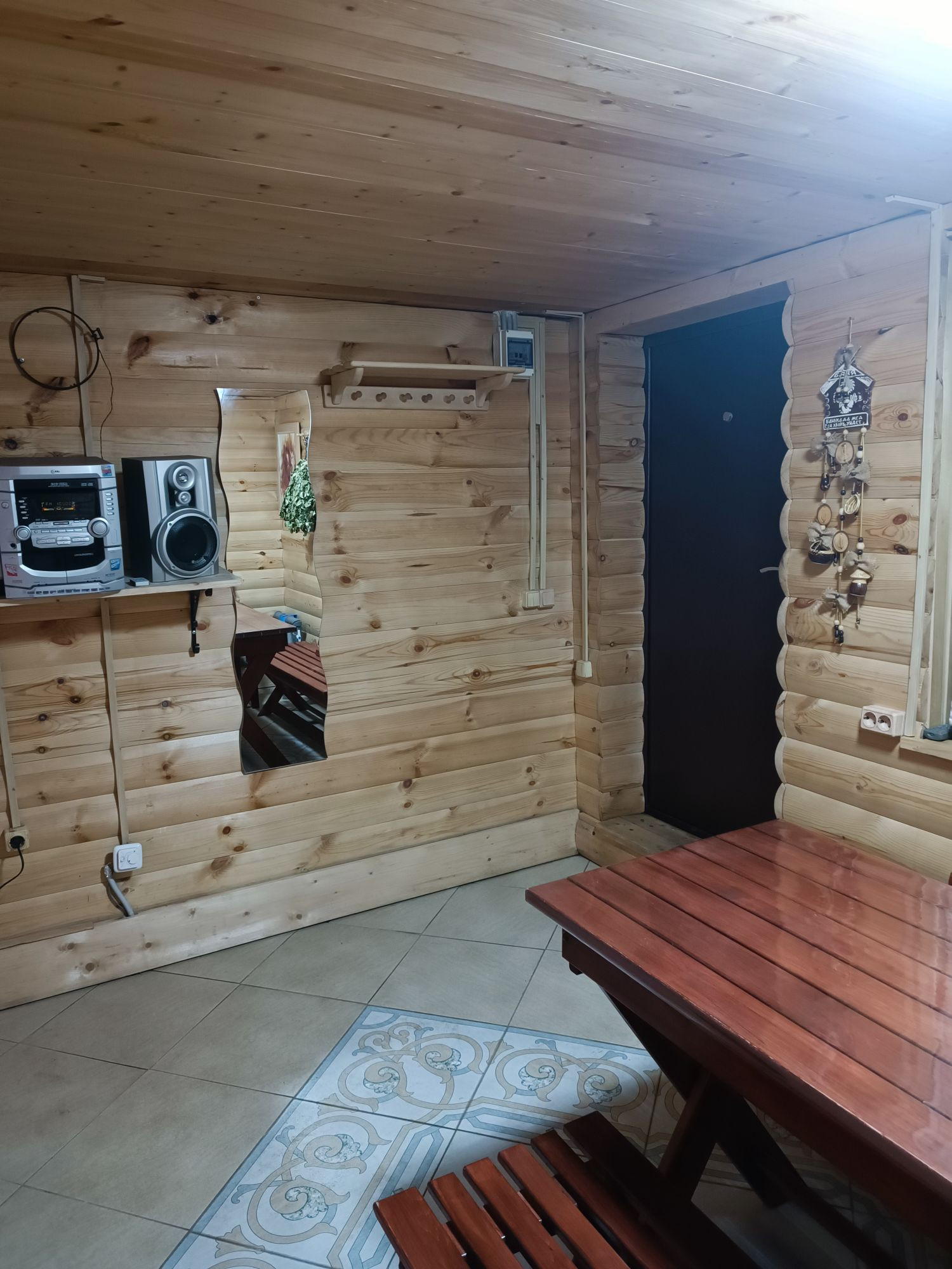 Баня 7м×4м, на дровах. Моечная и парилка отдельно, в предбаннике пол выложен плиткой, установлена система тёплый пол, вода из собственной скважины.