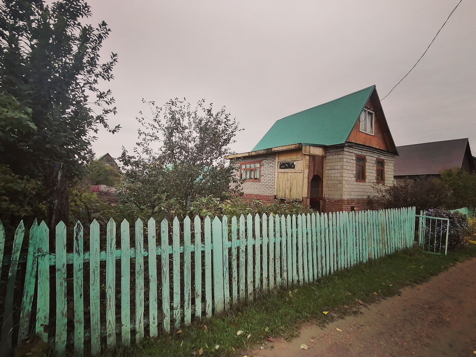 Крыши дома и бани покрыты профнастилом. Забор с крашеного штакетника.