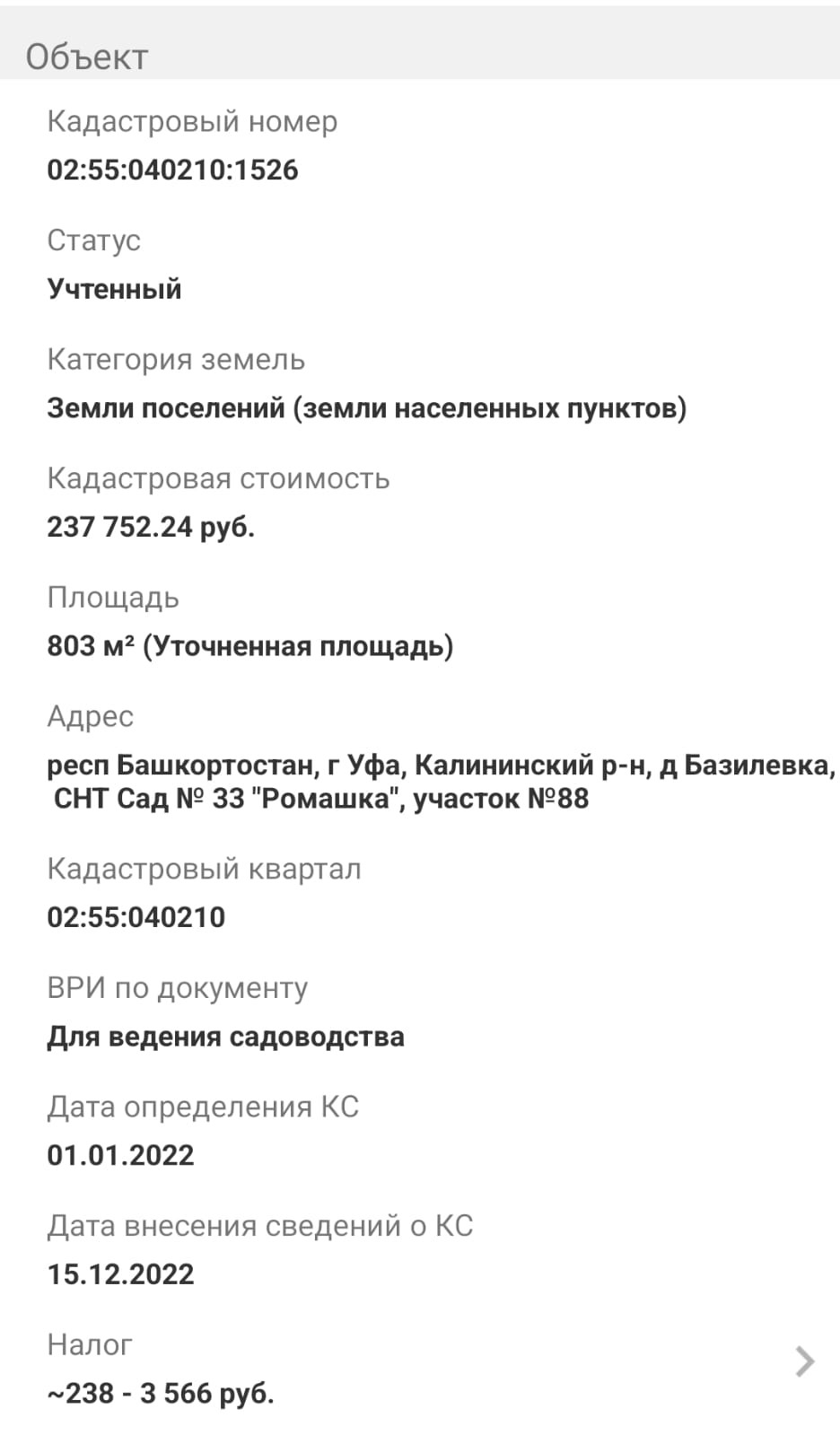 Продается земельный участок в СНТ №33 "Ромашка" Калининского района города Уфы.