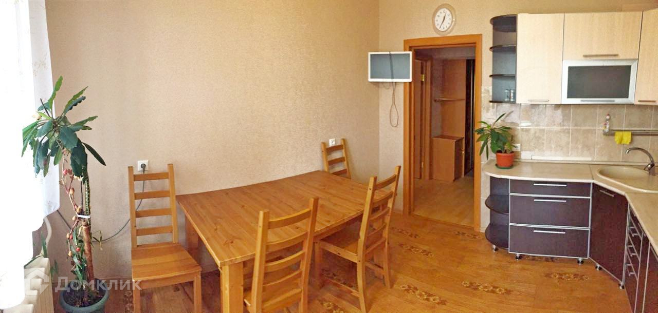На кухне имеется встроенная кухня, вытяжка, двухкамерный холодильник, микроволновая печь, кондиционер, телевизор, обеденный стол и стулья.
