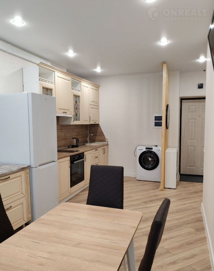 КУХНЯ-ГОСТИНАЯ продумана до мелочей! Стильный кухонный гарнитур со встроенной техникой, микроволновка, чайник, столовые приборы — здесь приятно готовить и наслаждаться домашними блюдами. Обеденный стол и стулья, удобный диван и телевизор создают уютную атмосферу для отдыха и приятных вечеров в кругу близких.