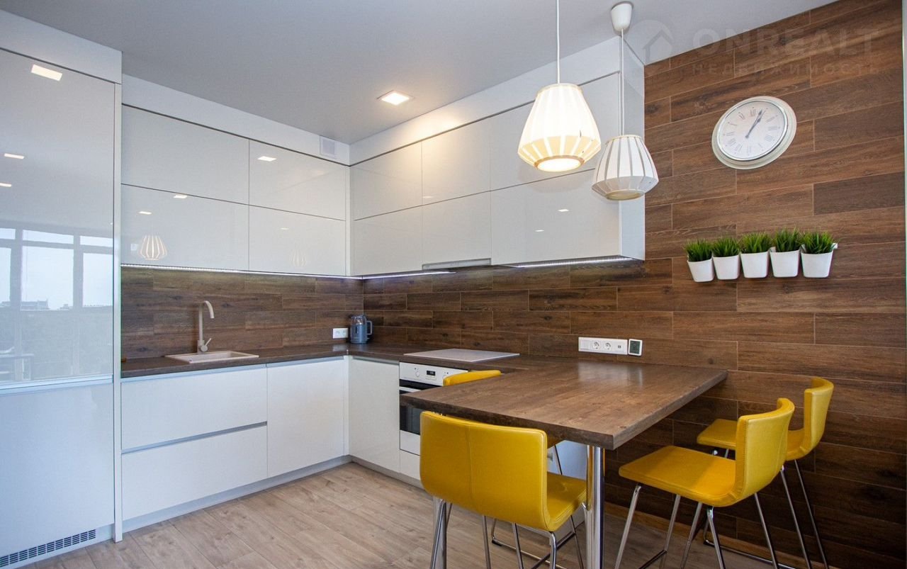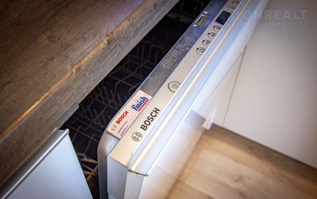 Общая площадь квартиры составляет 54,6 м². Просторная кухня-гостиная — это не только место для готовки, но и уголок для семейных ужинов и дружеских посиделок с прекрасным панорамным видом. Здесь уже установлена вся необходимая техника: индукционная плита, вытяжка, духовой шкаф, встроенный холодильник и посудомоечная машина.