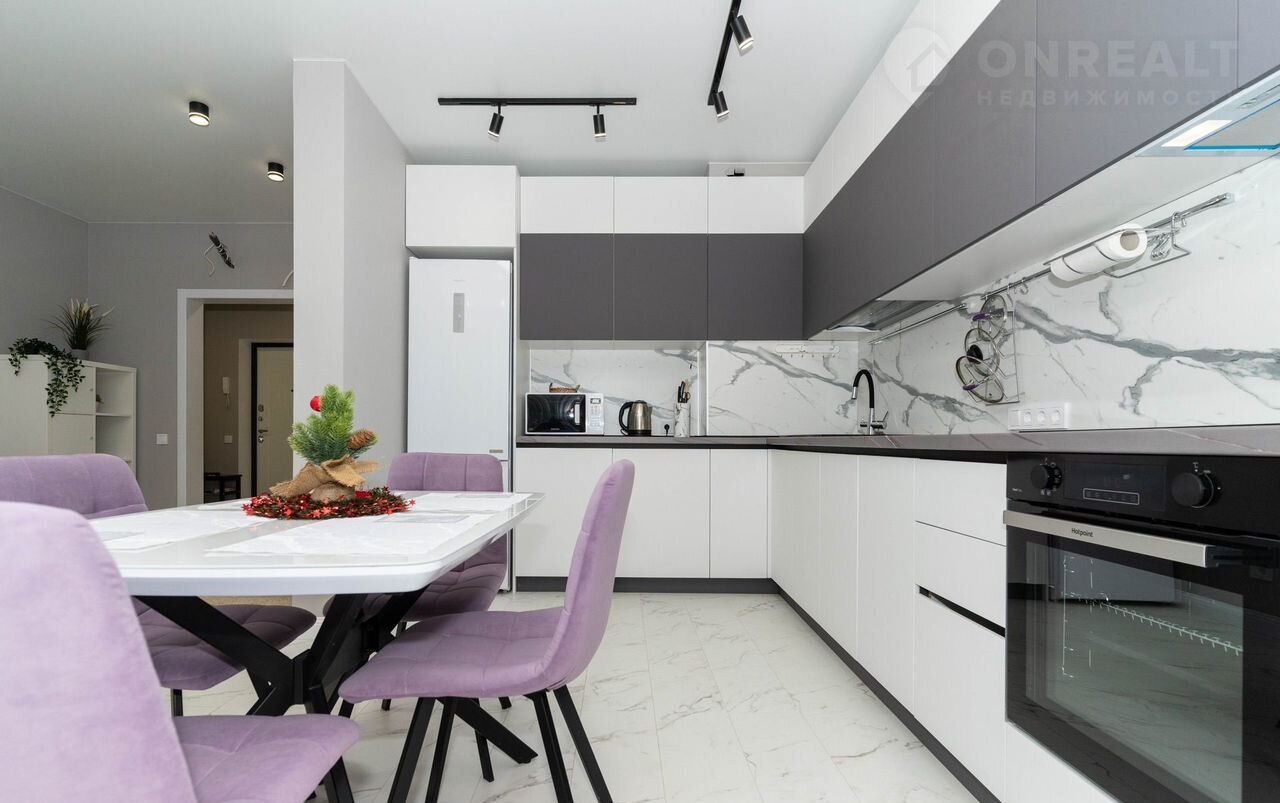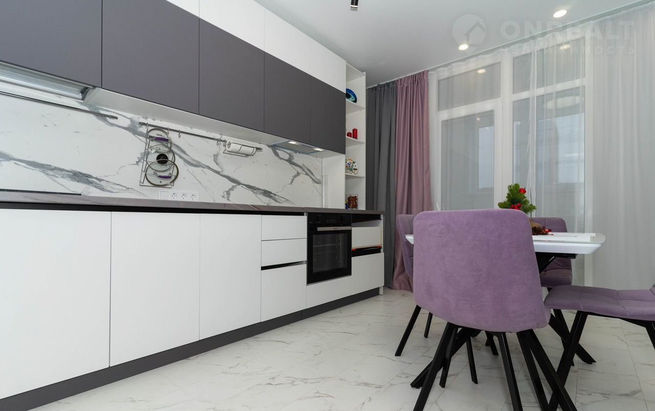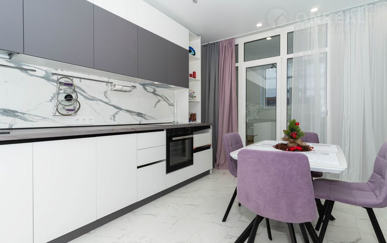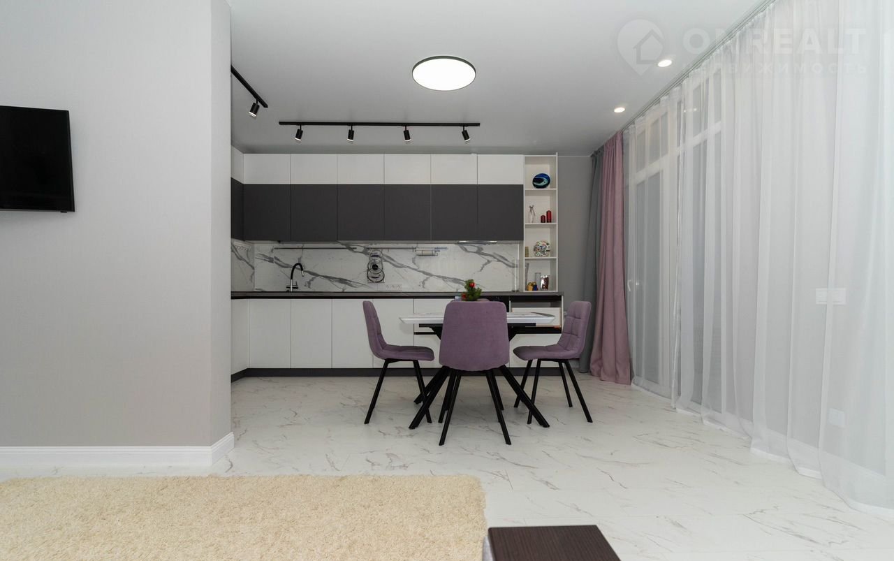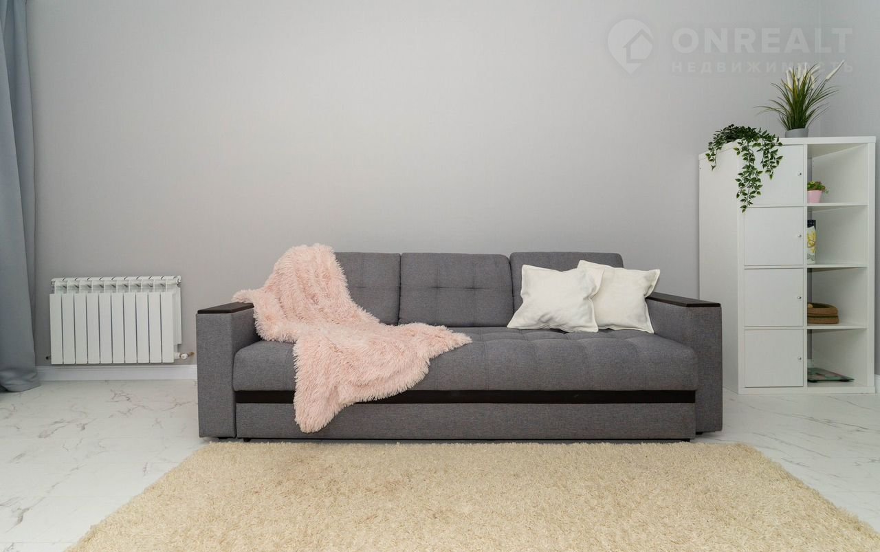 - Просторная кухня, соединенная с гостиной зоной, в которой расположен удобный раскладной диван