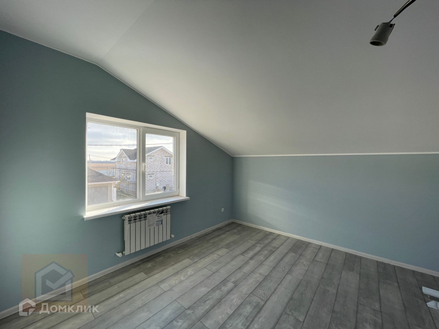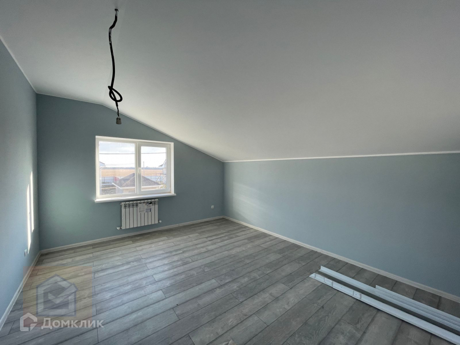 На первом этаже просторная кухня-гостиная, 2 спальные комнаты, санузел.