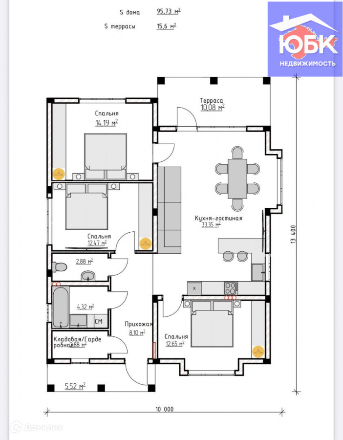 Площадь коттеджа: 95,7 кв.м., террасы 10,08 кв.м: Кухня-гостиная 33,35 кв.м., 1 спальня 12,65 кв.м., 2 спальня 14,19 кв.м., 3 спальня 12,47 кв.м., прихожая 8,10 кв.м., гардеробная 2,88 кв.м., с/у 7,21 кв.м. (раздельный), крыльцо 5,52 кв.м.