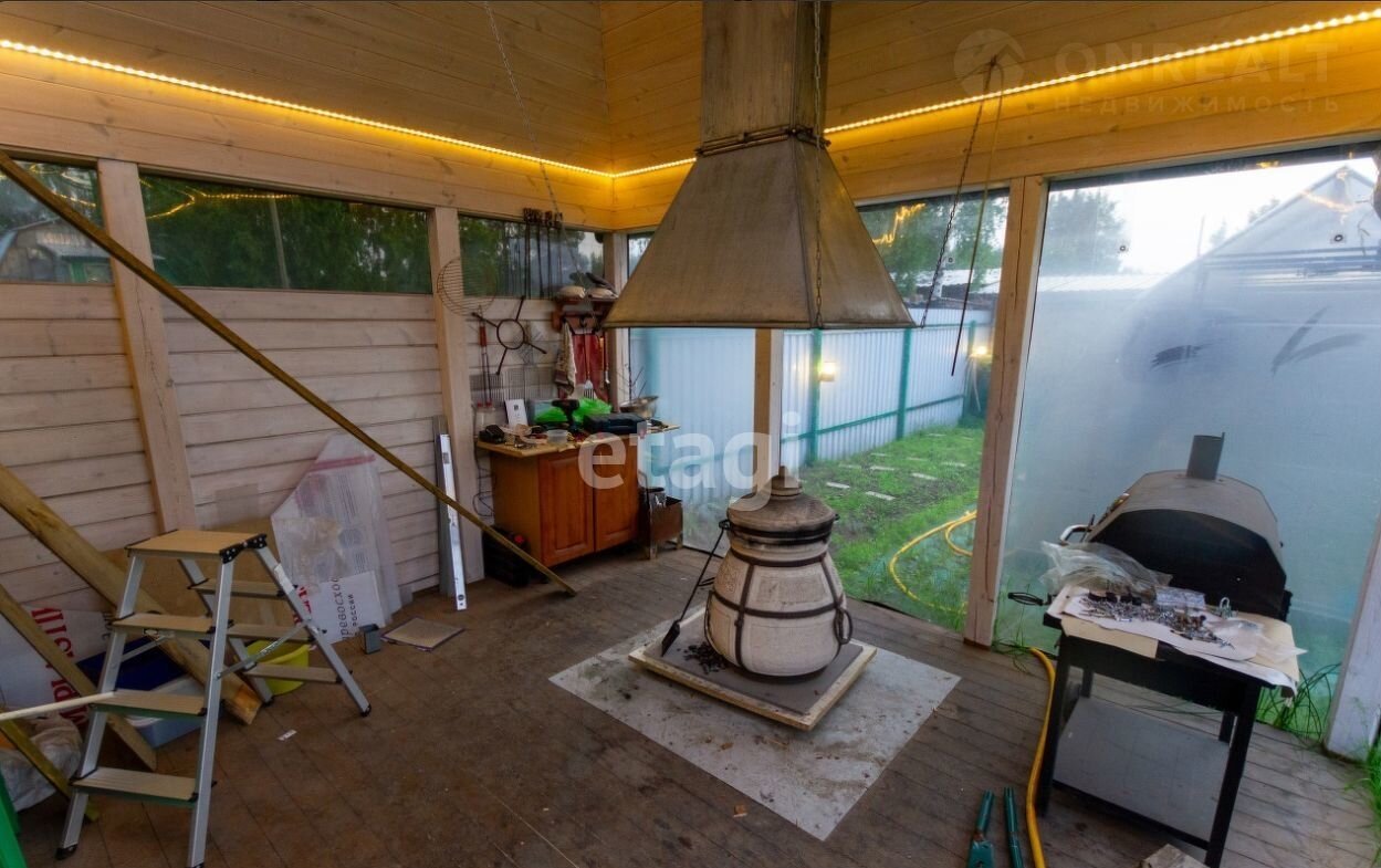 Барбекюшная всепогодная потому, что обтянута мягкими окнами. В ней стоят тандыр и гриль. Тандыр за раз делает еды на 10 человек.