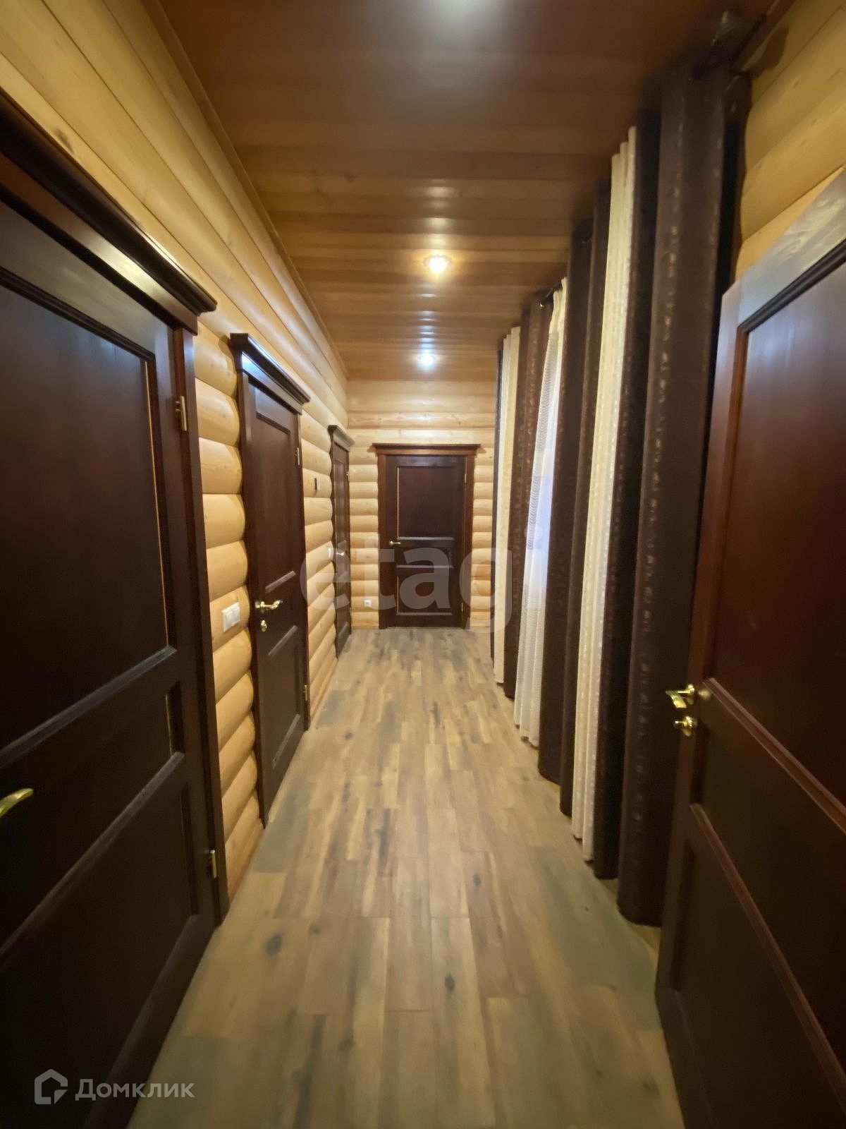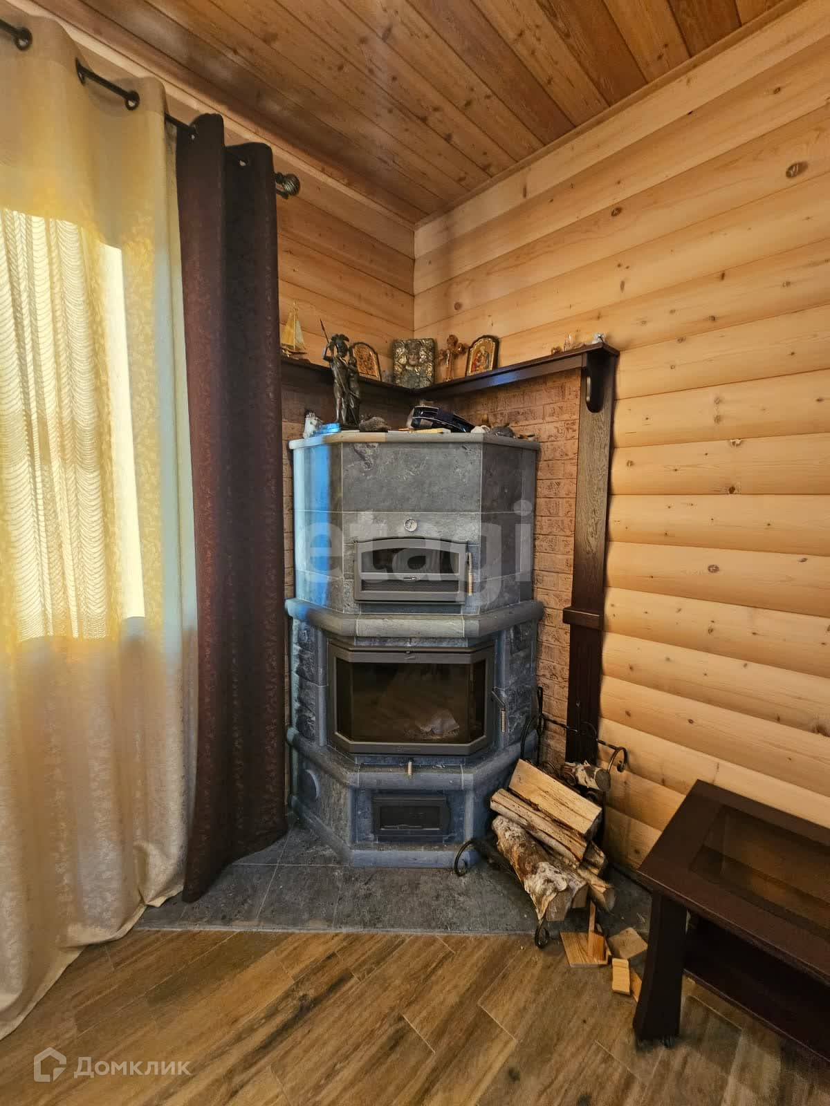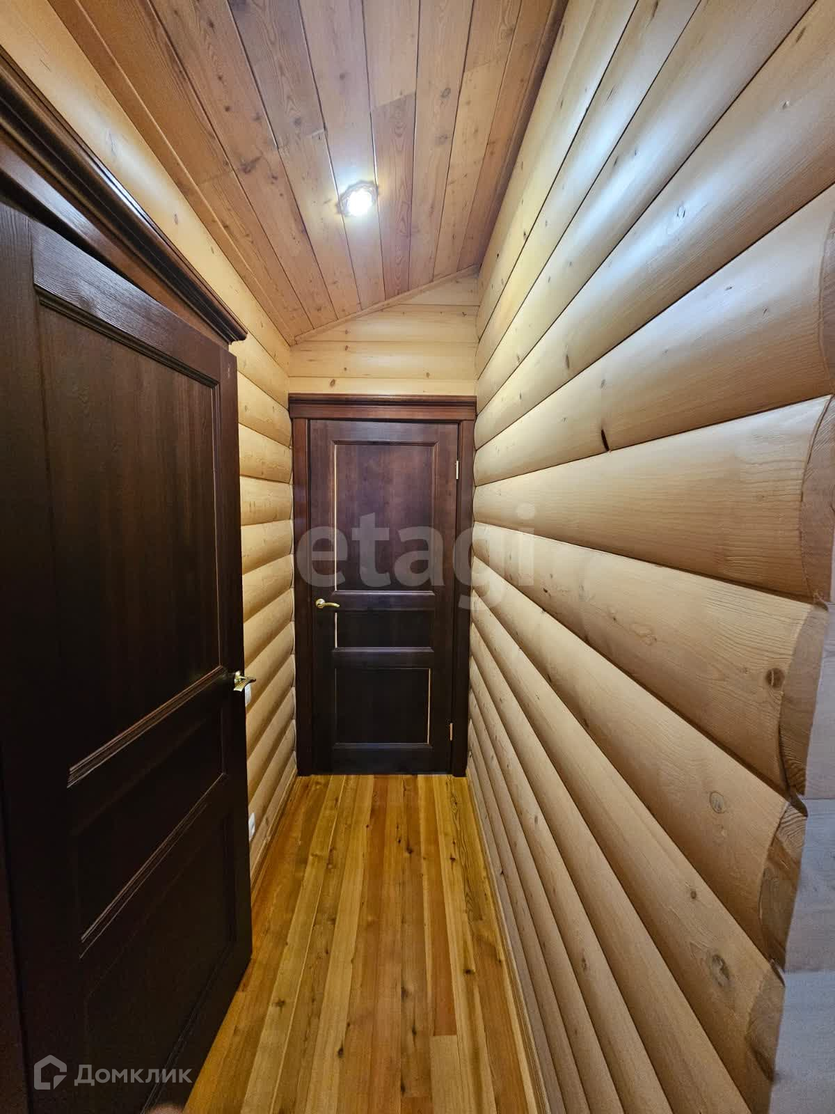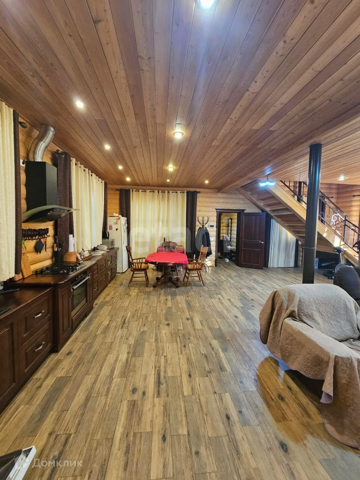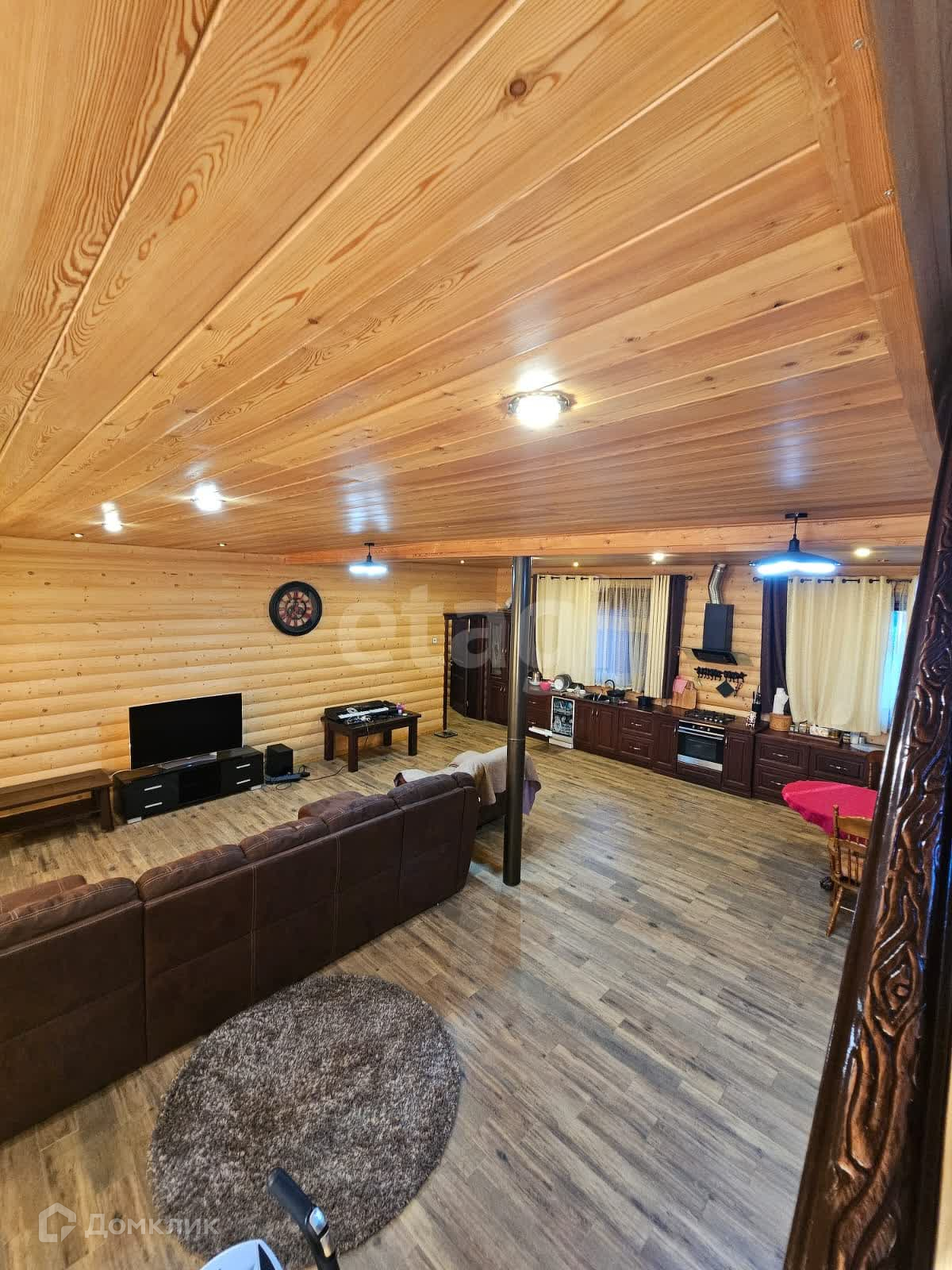 Двухэтажный дом имеет высококачественную отделку внутри и снаружи. Стены выполнены из блок хауса сосны, потолки и лестница - из лиственницы. На первом этаже установлены теплые полы с плиткой, а также финский камин и арктические окна, обеспечивающие отличную звуко- и теплоизоляцию. Кухня оборудована мебелью из дуба и посудомоечной машиной. Дополнительные удобства включают постирочную зону, санузел и сухой подвал.