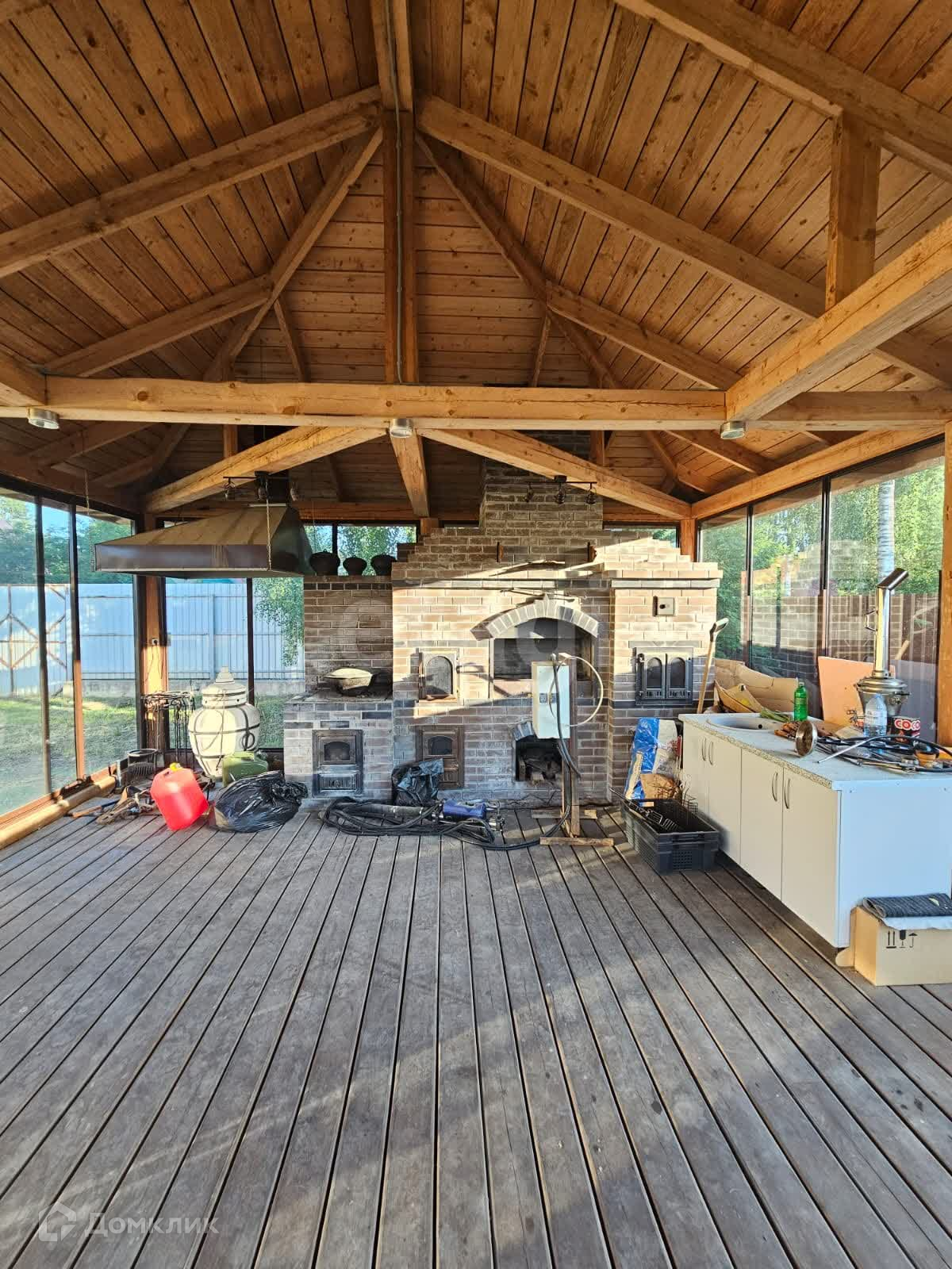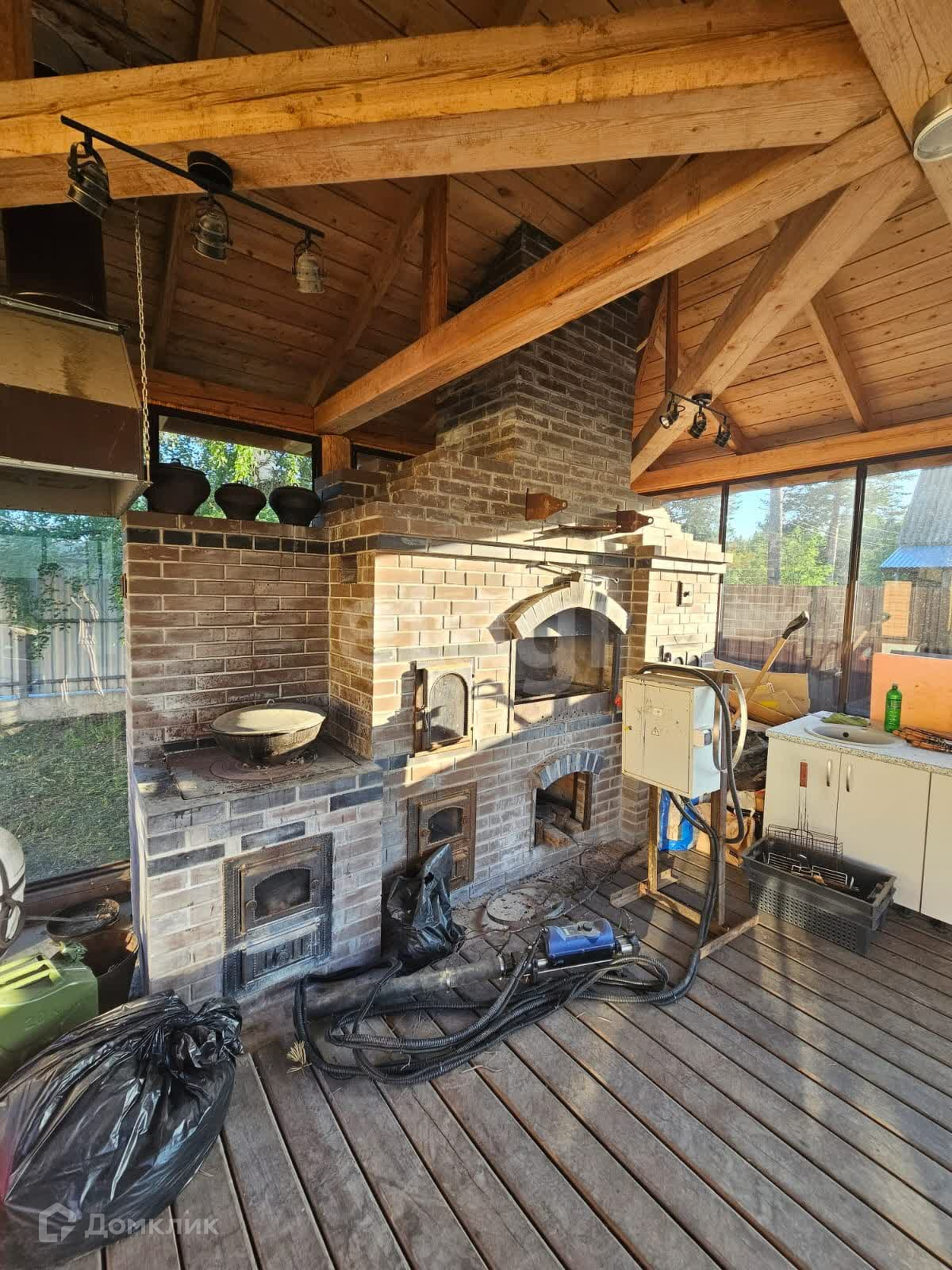 На участке имеется брусчатка на автостоянке, электроприводные ворота, ровная площадка для установки большого летнего бассейна, лиственничная площадка перед гостевой комнатой и ухоженный газон. Беседка с кирпичной зоной барбекю обеспечивает комфортное место для отдыха и приготовления пищи, а стеклянная застекленная конструкция обеспечивает зону для укрытия от непогоды.