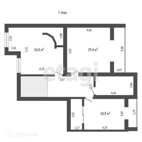 На втором этаже расположены: кабинет со встроенной гардеробной (18,9 + 4,3 м.кв.), комната (26,8 м.кв.), спальня (29,4 м.кв.), сан.узел (9,6 м.кв.).