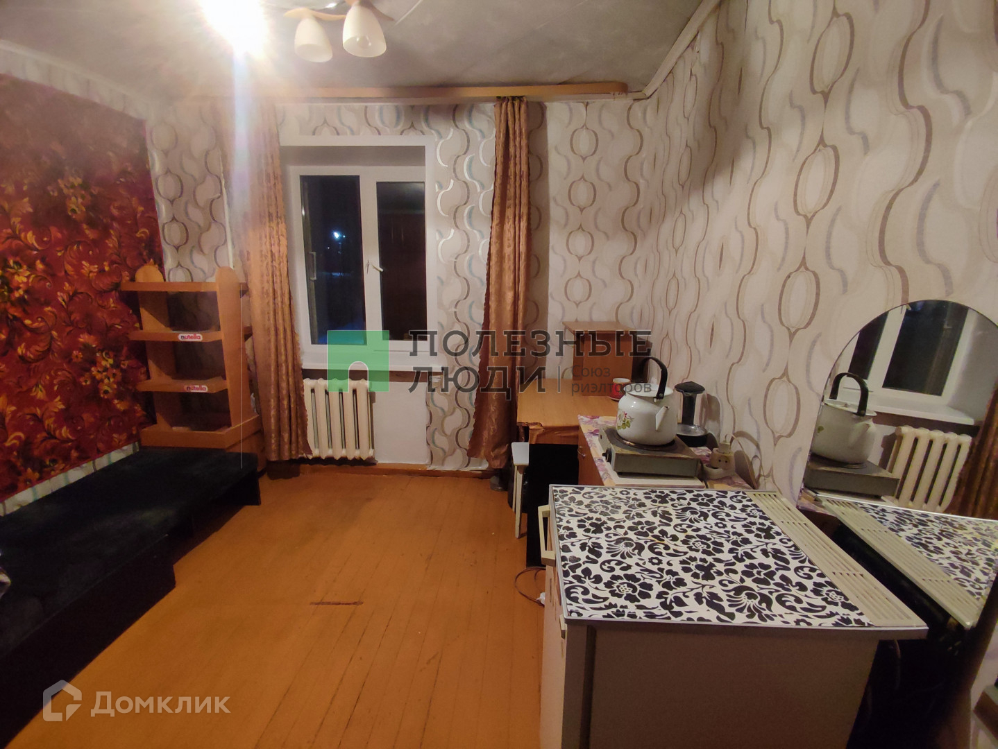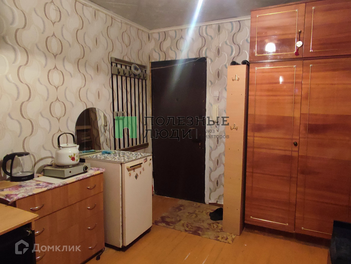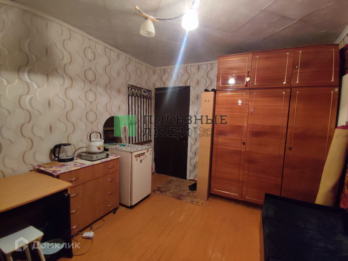 Секция чистая, спокойные семейные соседи. В комнате имеется шкаф, спальное место, кухонный стол, электрическая плита, холодильник, стиральная машина.