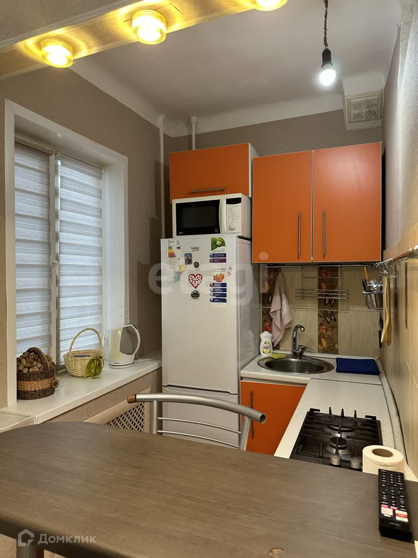 Квартира укомплектована всей необходимой мебелью, крупной и мелкой бытовой техникой: шкаф-прихожая, кухонный гарнитур, стол и стулья, холодильник, стиральная машинка, микроволновка, электрочайник, диван-кровать, телевизор, робот-пылесос, утюг, гладильная доска.