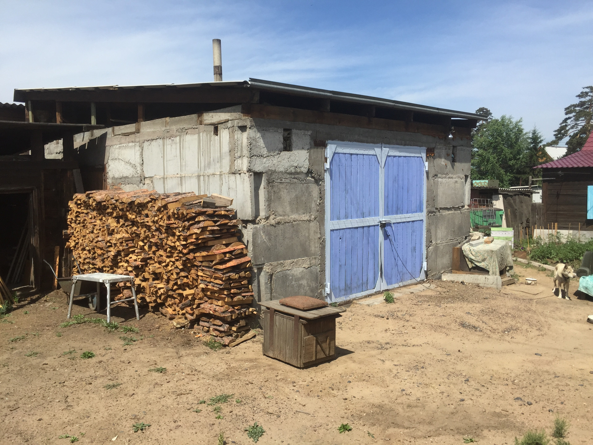 На участке расположены капитальный гараж из блоков (со смотровой  ямой, погребом и печкой), бревенчатая баня, насаждения и хоз. постройки.