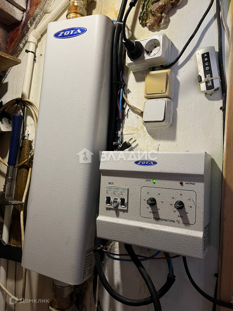 Отопление комбинированное: печь с встроенным котлом + электрокотёл, по периметру стоят радиаторы.