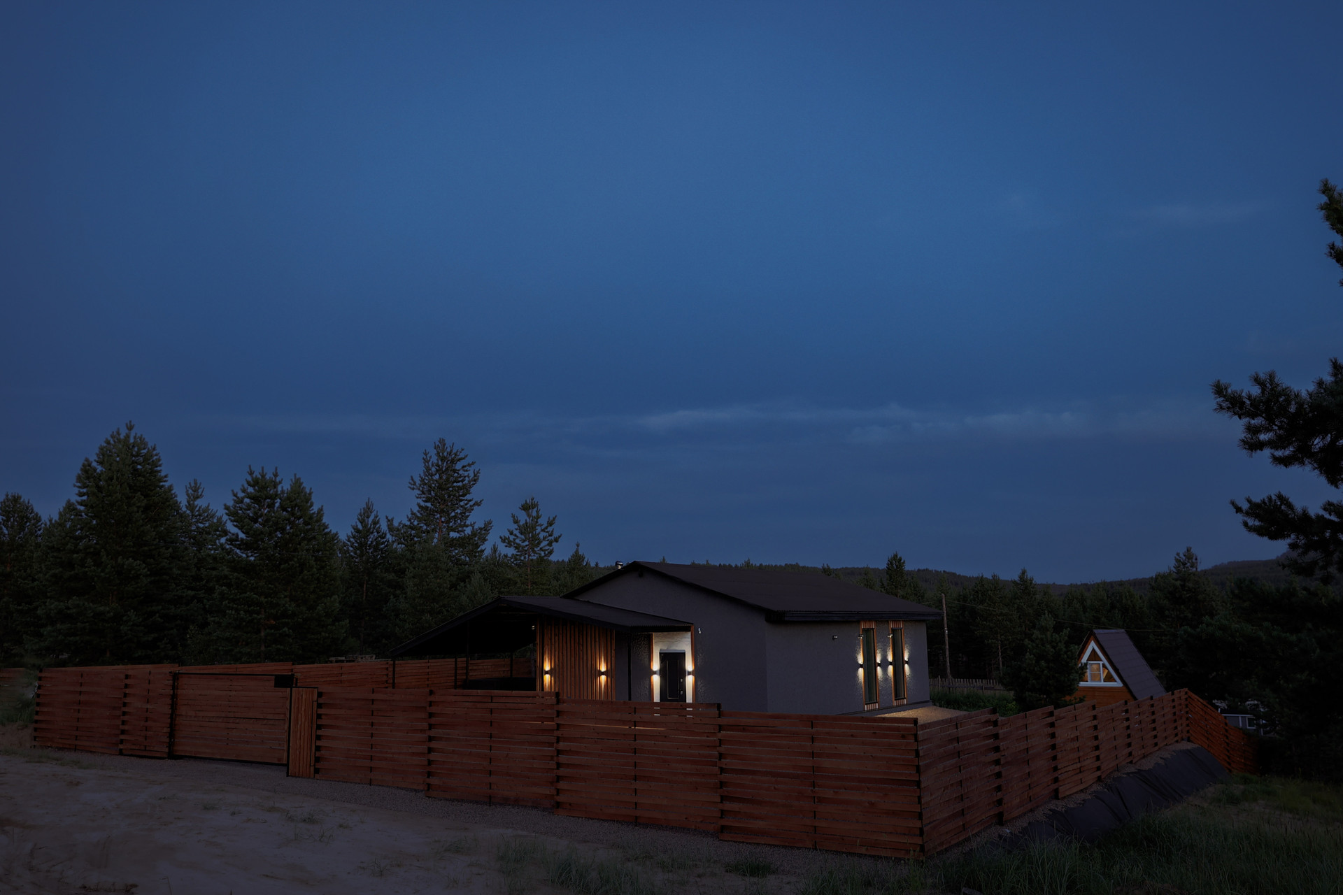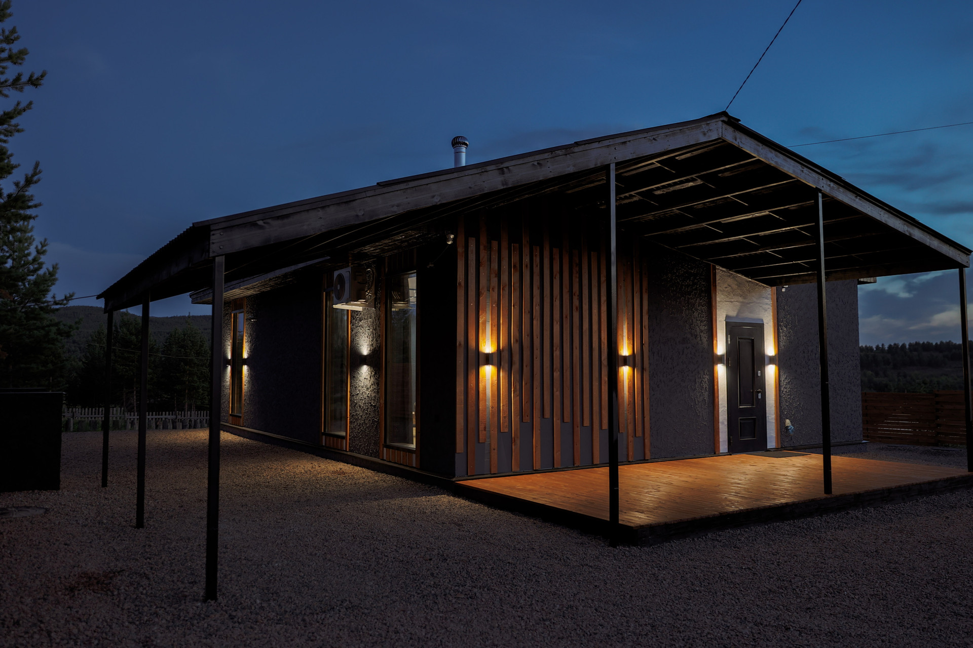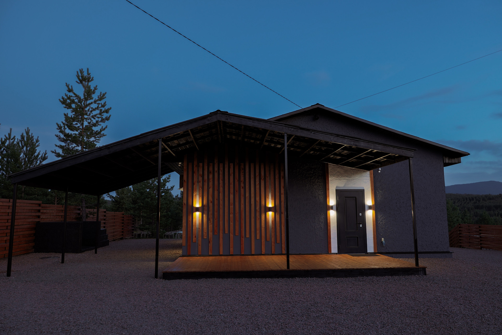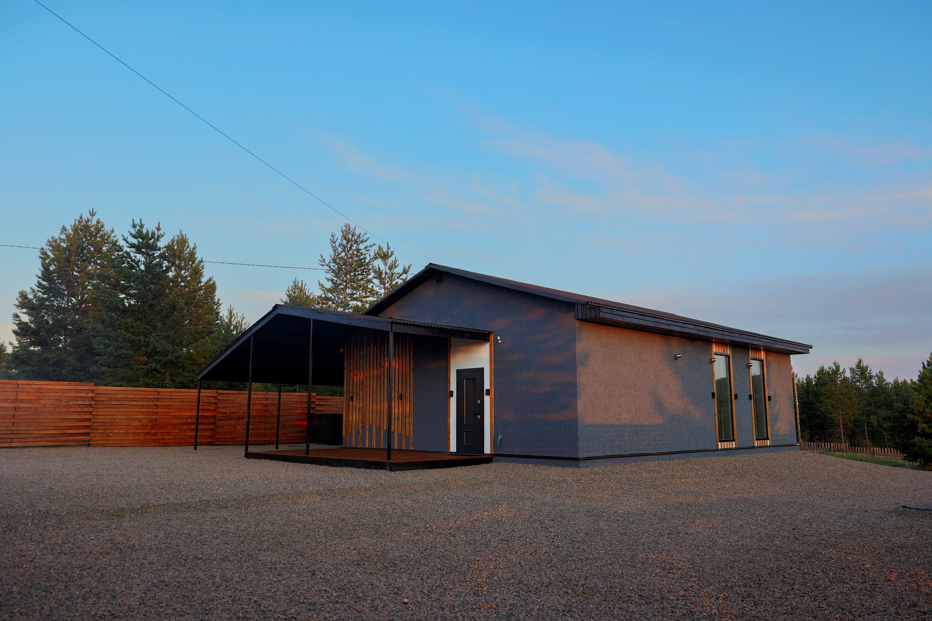 Дом оборудован террасой и навесом для машины, а вся территория отсыпана щебнем с геотекстилем. Забор из плетеной древесины с автоматическими воротами обеспечивает уединение и стиль.
