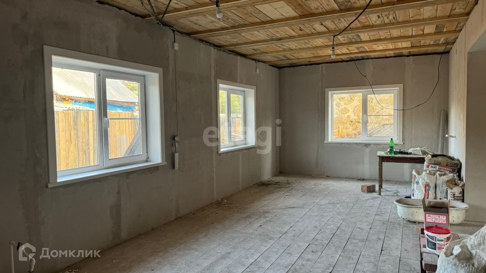 Выполнена предчистовая отделка: стены выровнены, полы лиственница, в санузле полы залиты (не доски), стеклопакеты. Дом полностью оштукатурен снаружи и изнутри.
