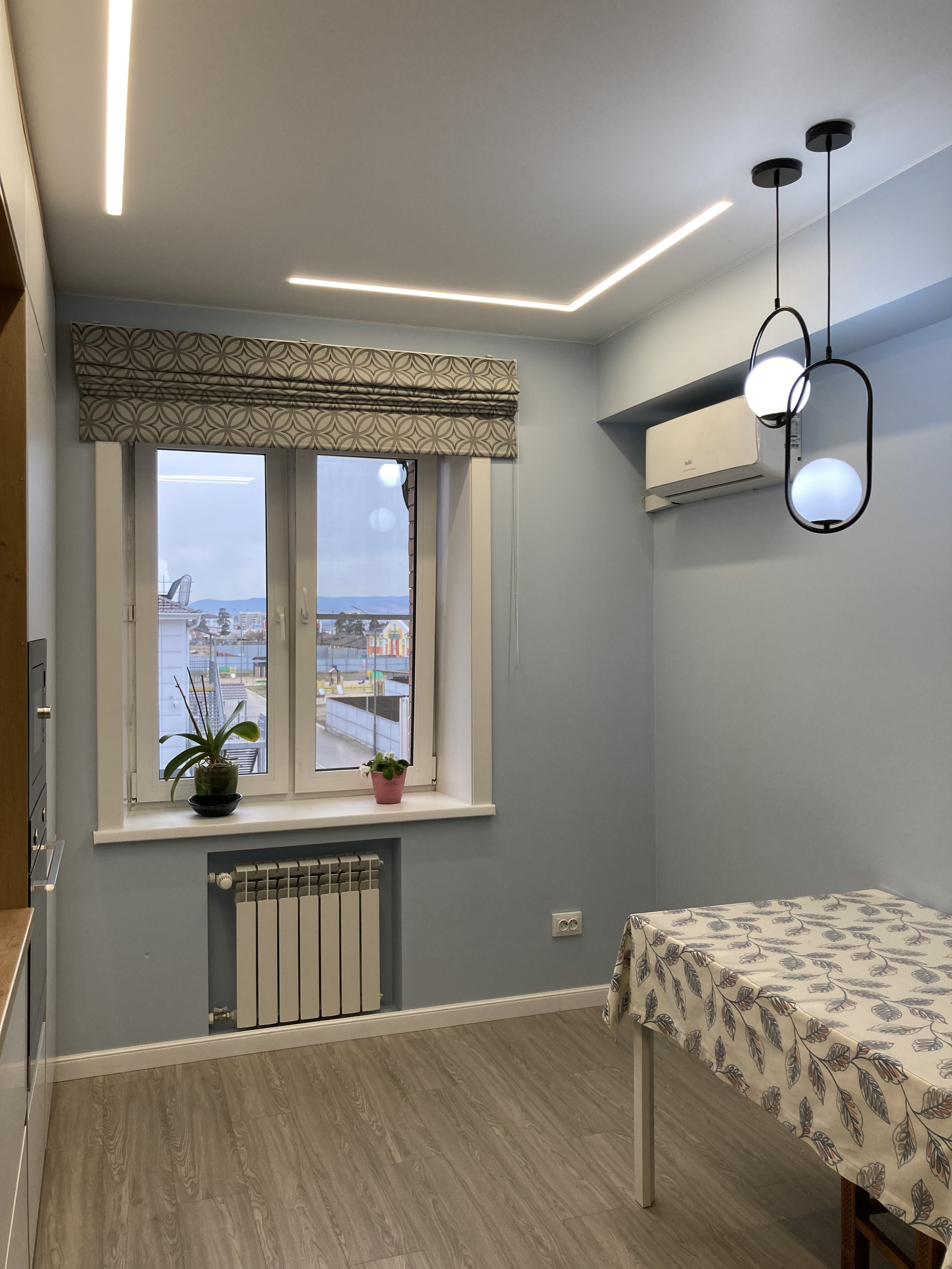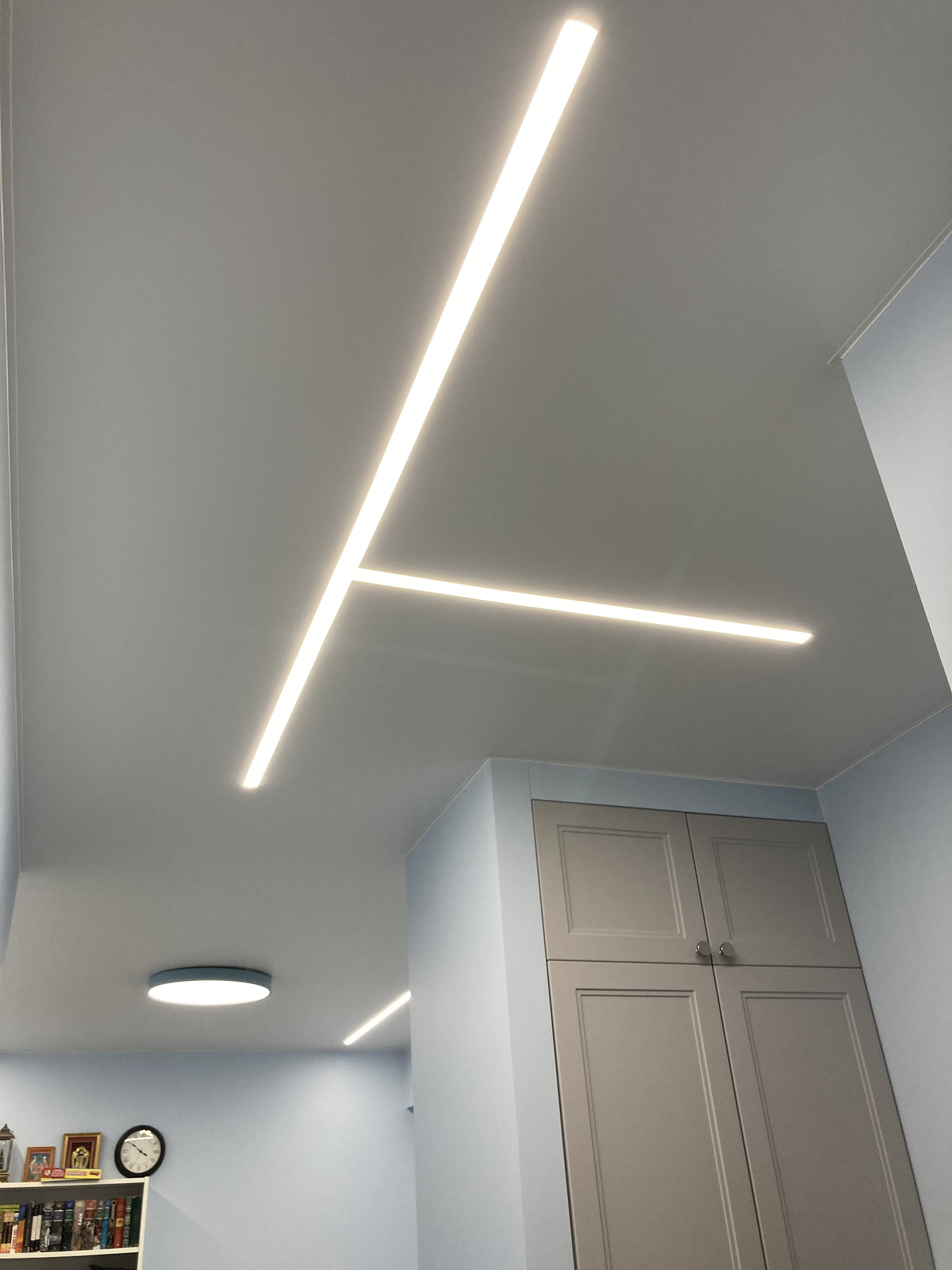 Потолок - натяжной, в качестве освещения использованы современные световые линии, бра, скрытая подсветка, в квартире очень светло вечернее время, в дневное время светло за счёт дневного света с окна.