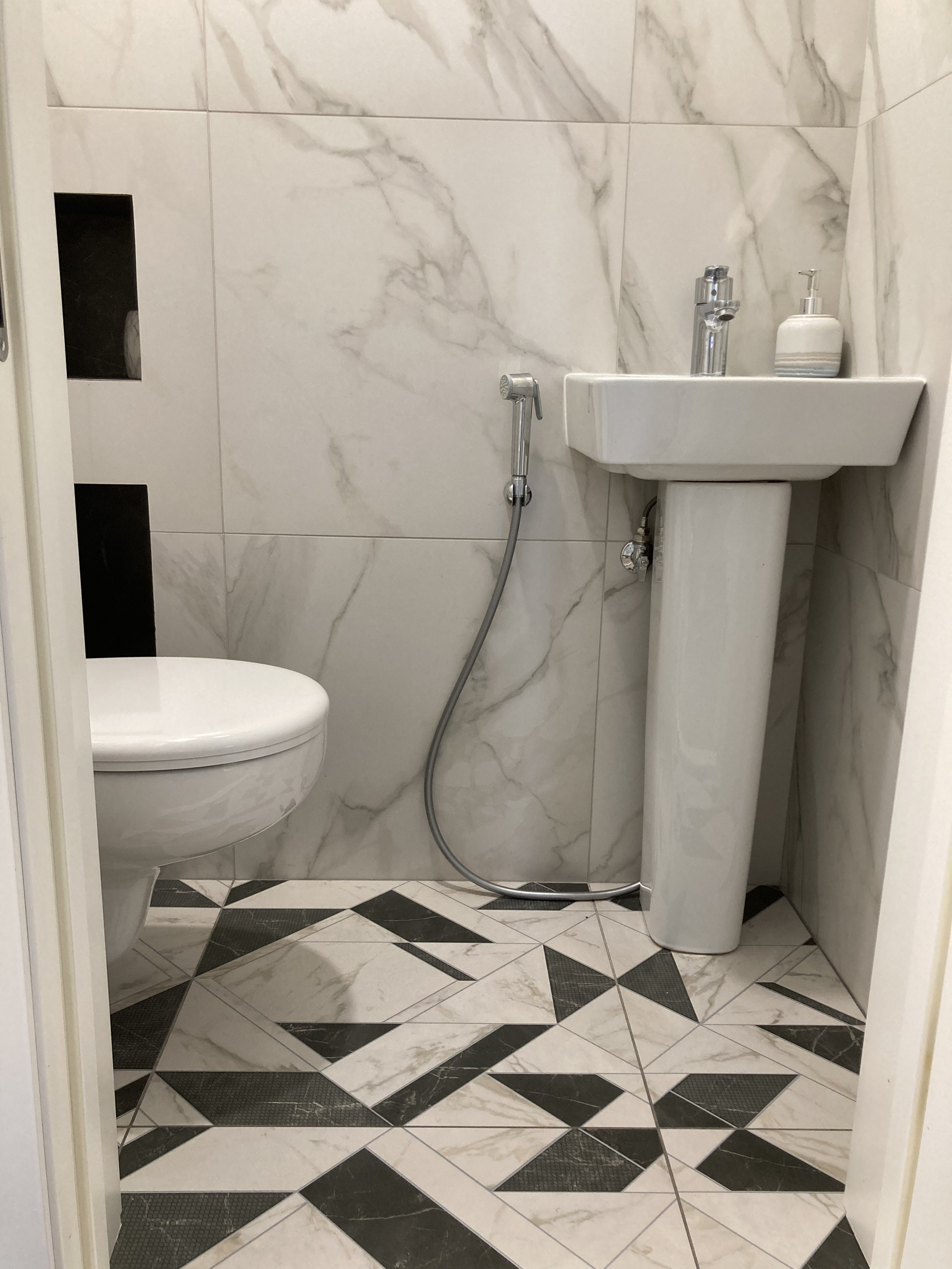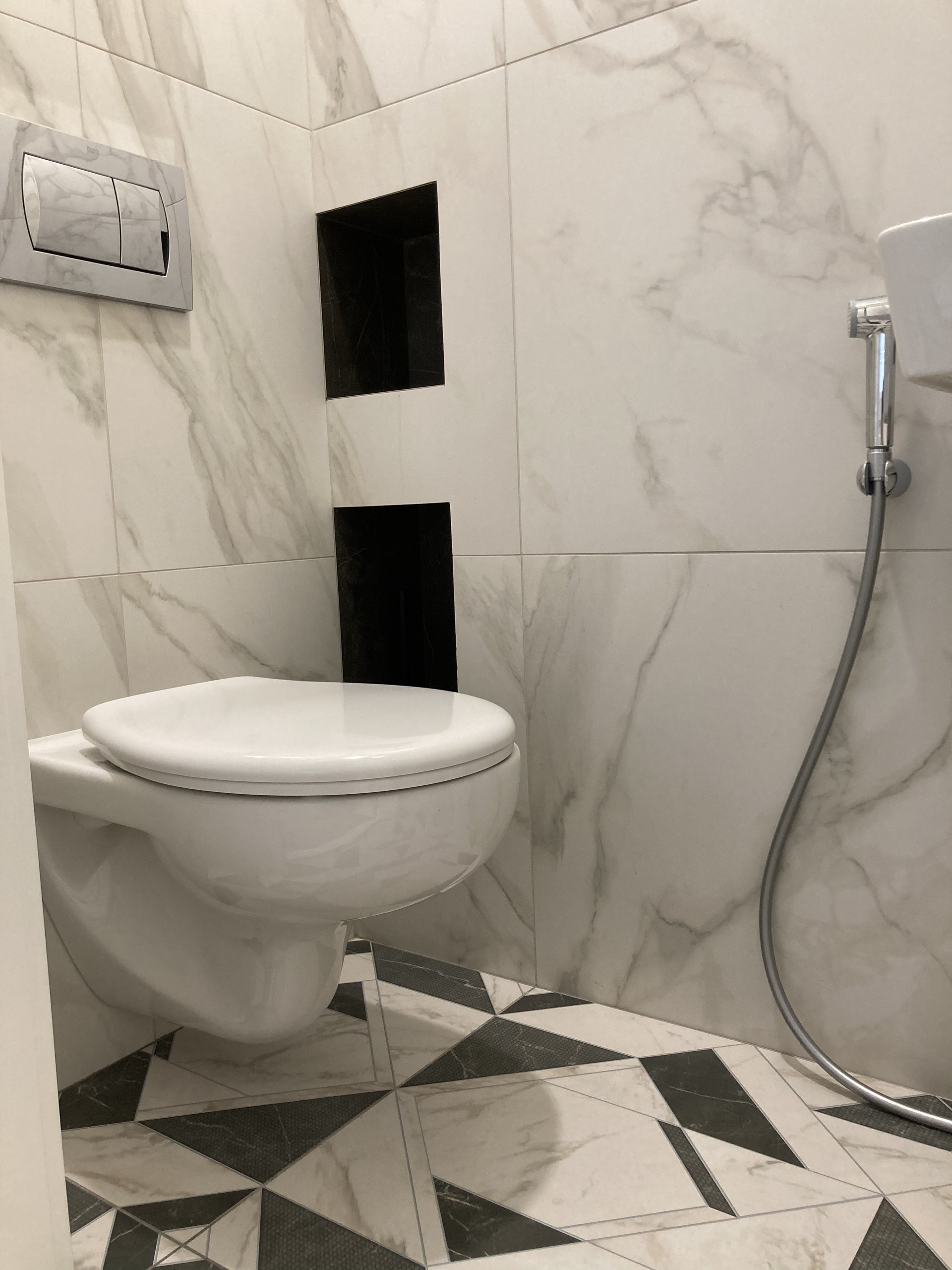 туалет - инсталляция с подвесным унитазом, установлен гигиенический душ, полки для ёршика скрытые на весу.