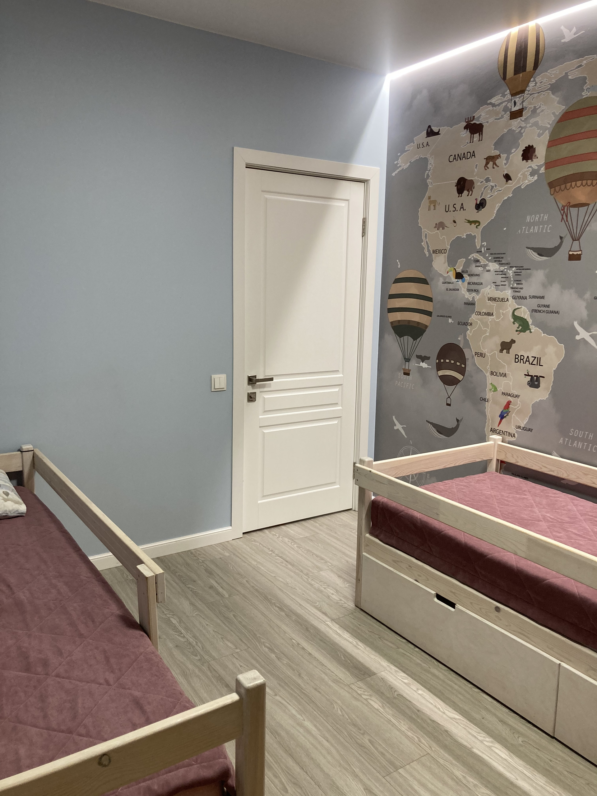 В Детской комнате одна стена оформлена моющимися фотообоями с рисунком карты мира.