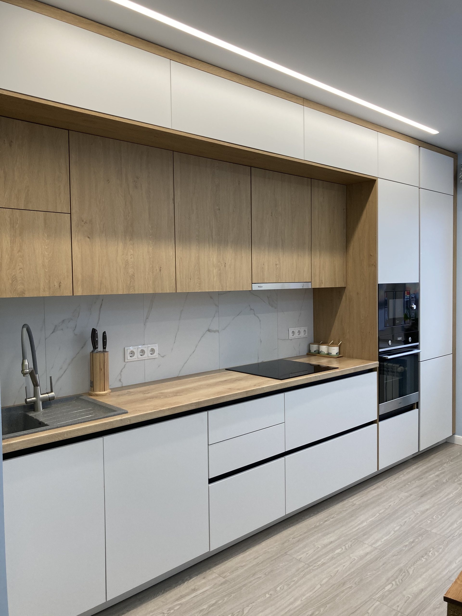 Встроенная кухня и вся кухонная техника ( духовой шкаф, микроволновая печь, индукционная варочная панель, встроенный холодильник, вытяжка, сместитесь с фильтром для питьевой воды) остаётся с квартирой, фурнитура у кухни Blum, подсветка независимая.