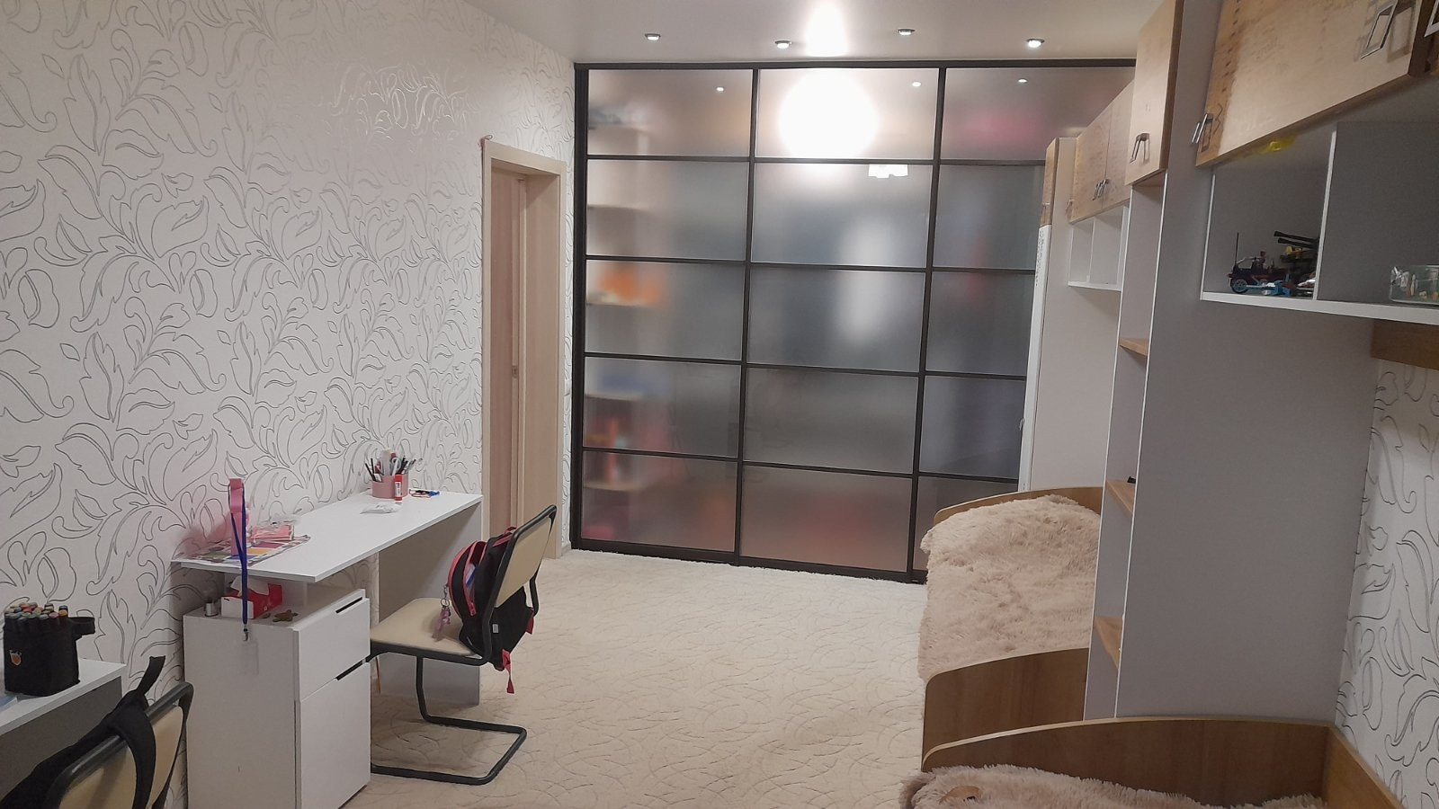 Удобная детская для двух детей, где есть и зона отдыха и рабочая зона .
