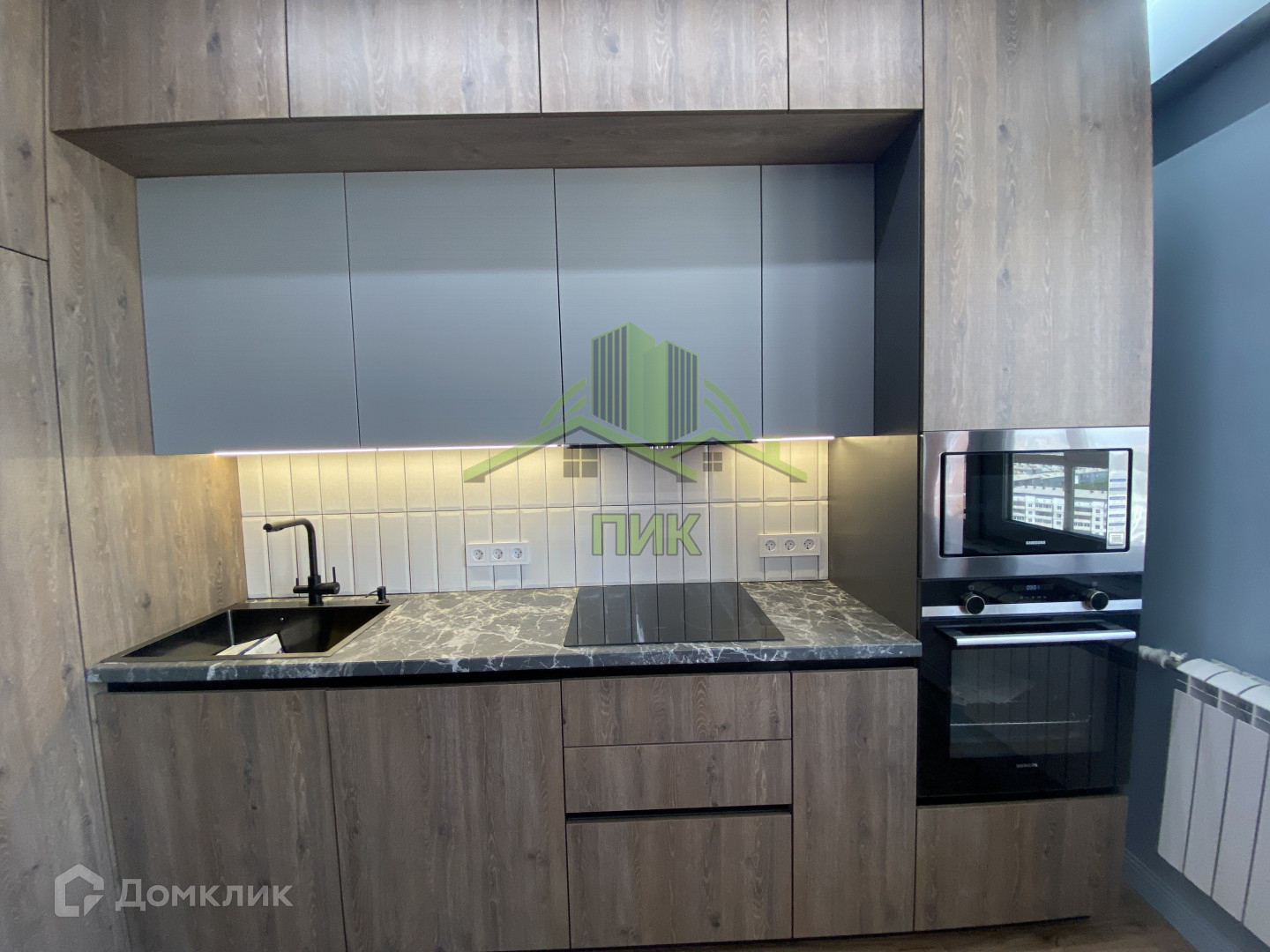 кухонный гарнитур полностью на доводчиках, наполнен встраиваемой техникой: