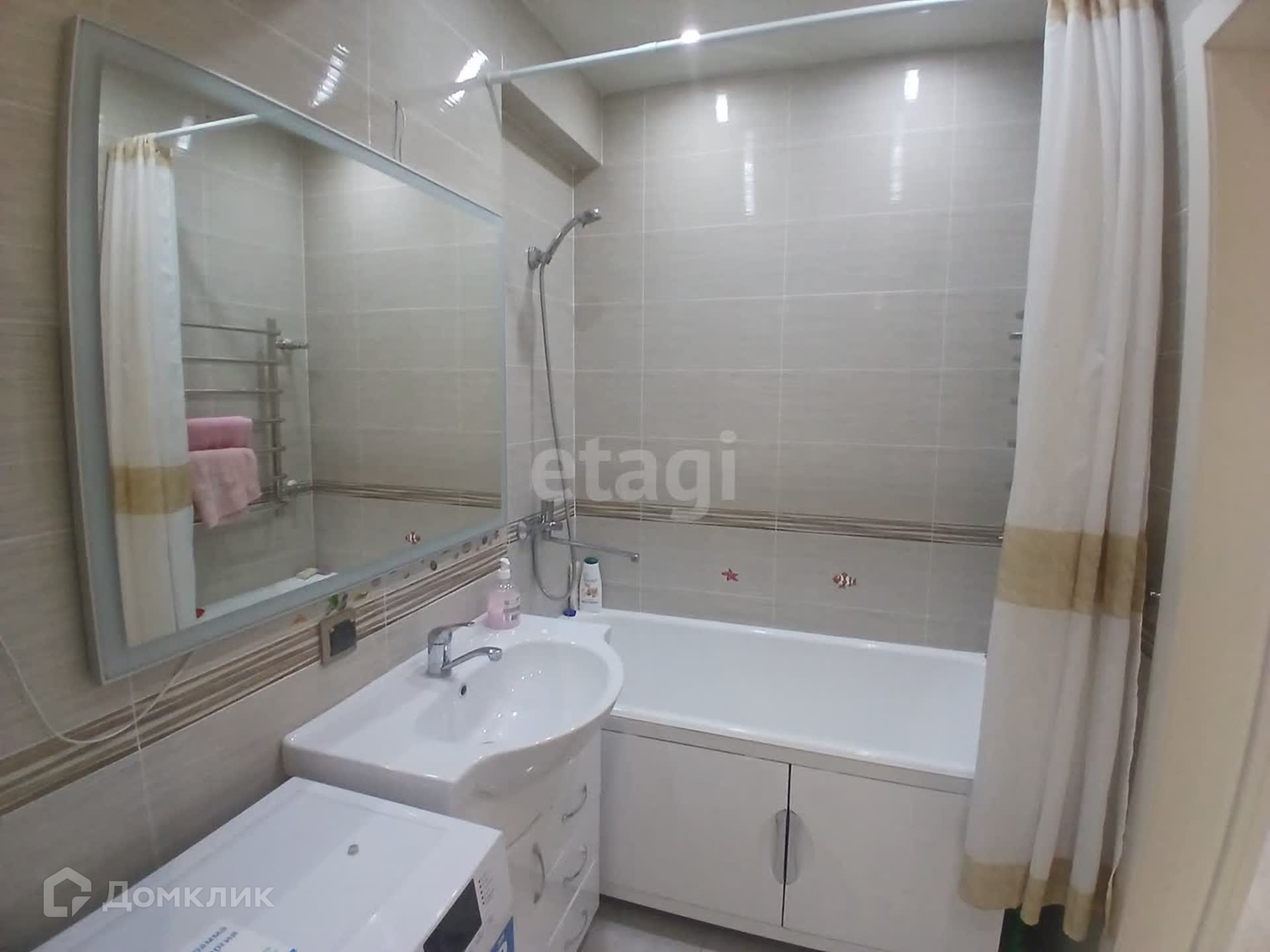 Внутреннее пространство квартиры оформлено в современном стиле с использованием качественных материалов. Качественный современный ремонт: стены выровнены и окрашены, натяжной потолок с точечным освещением, на полу ламинат, пластиковые стеклопакеты, биметаллические радиаторы. Санузел совмещенный с новой сантехникой, облицован кафелем.