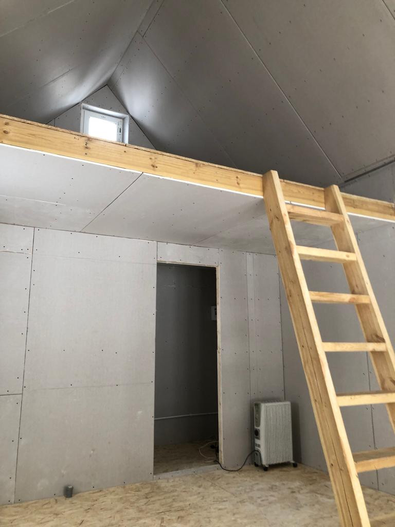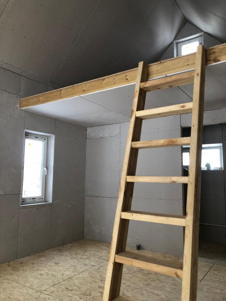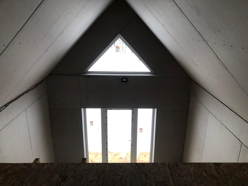 -Отделка внутри; пол OSB, стены ГКЛ, витражные окна REHAU ( двойной стеклопакет, толщина 70 мм, мультифлекс)