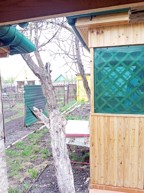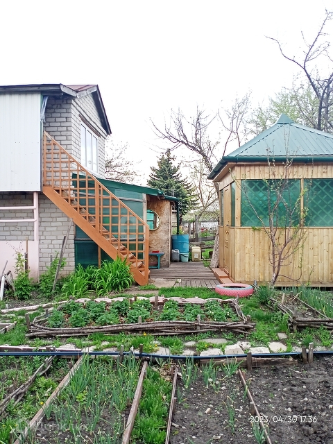 Отдельно от дома стоит деревянная беседка, обшитая деревом со всех сторон, окна в ней снимаются.