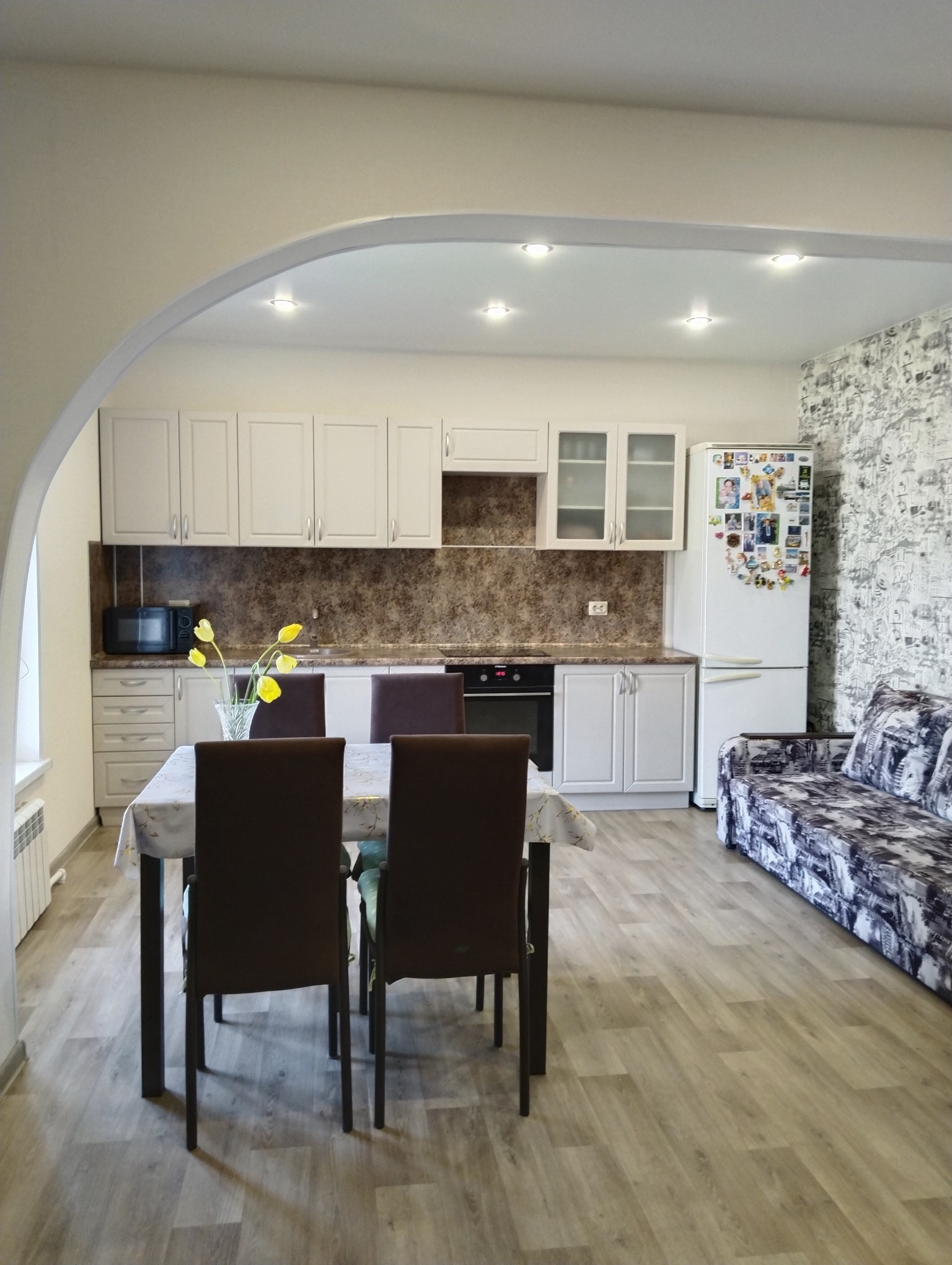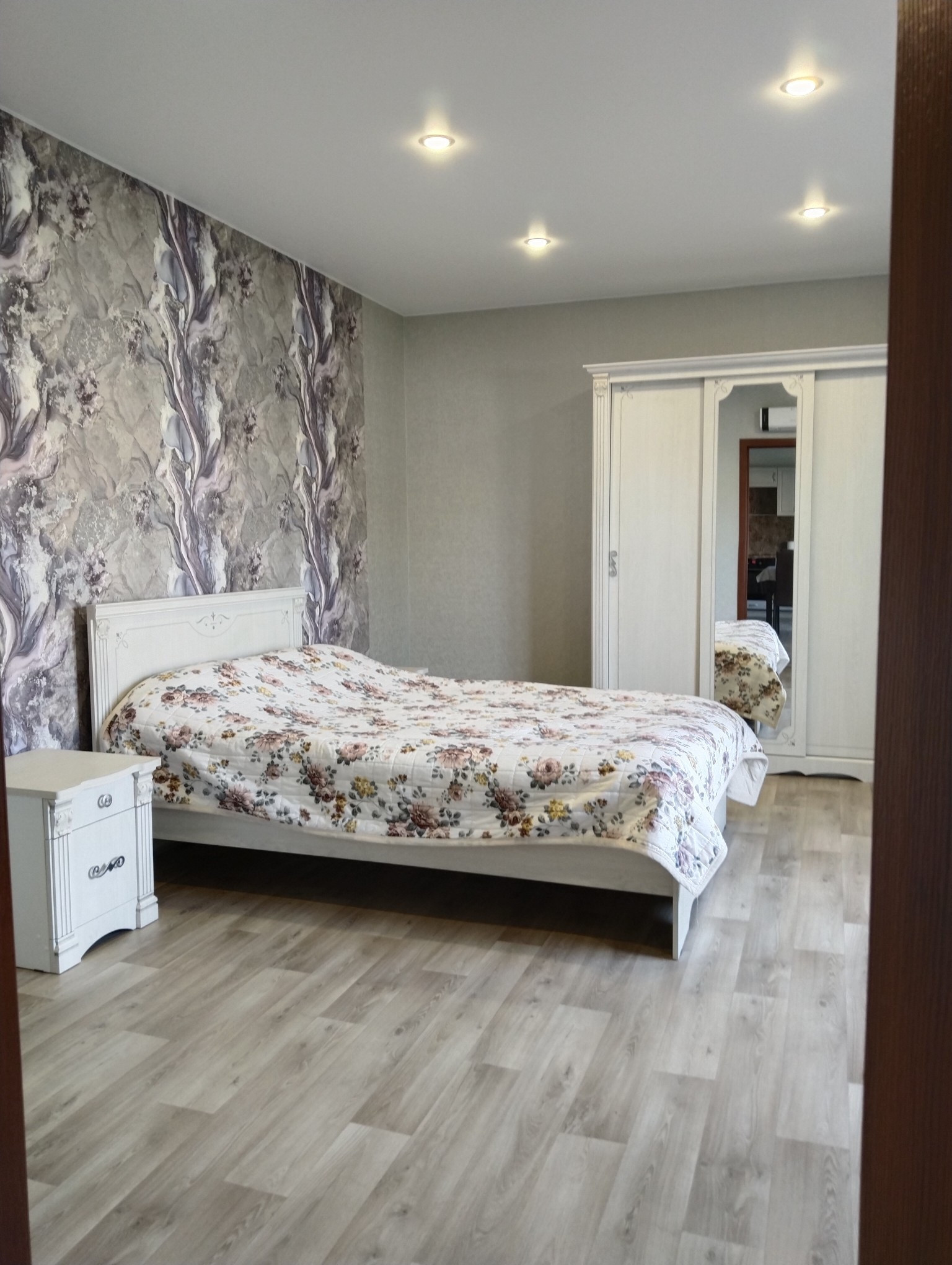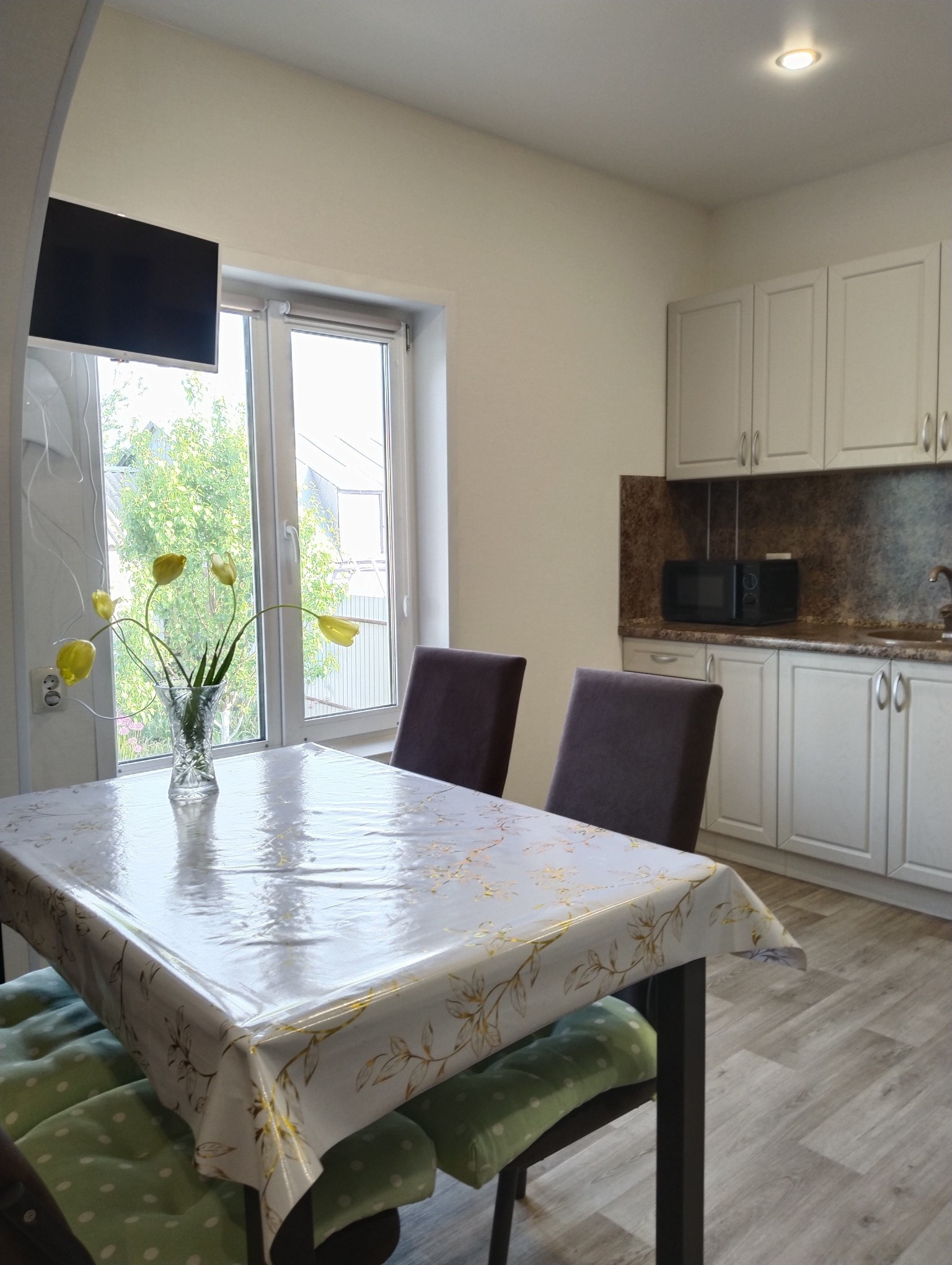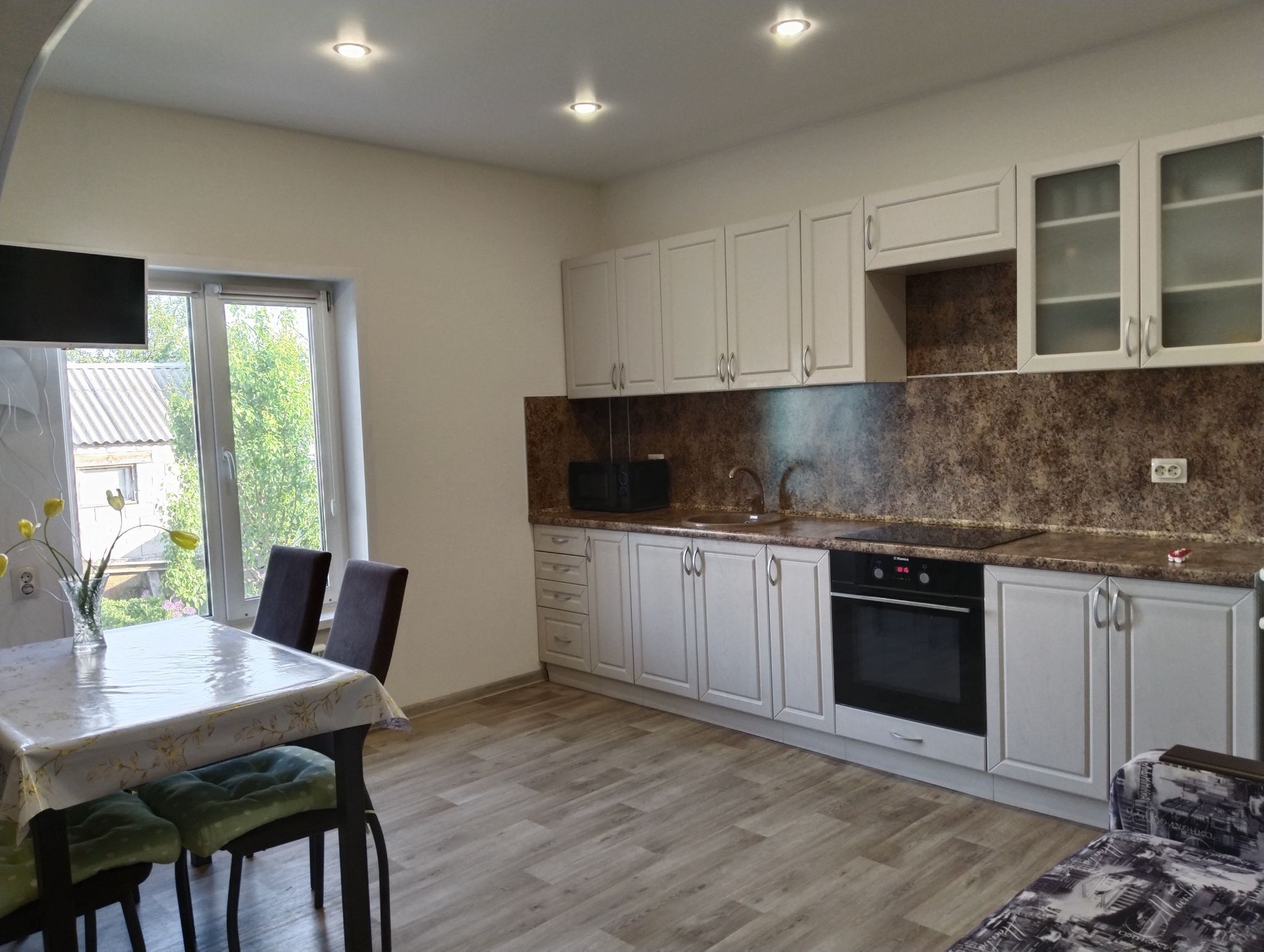 Любая хозяйка оценит просторную кухню- гостинную с выходом во двор. Так же на этаже имеются три спальни, два сан узла, гардеробная.