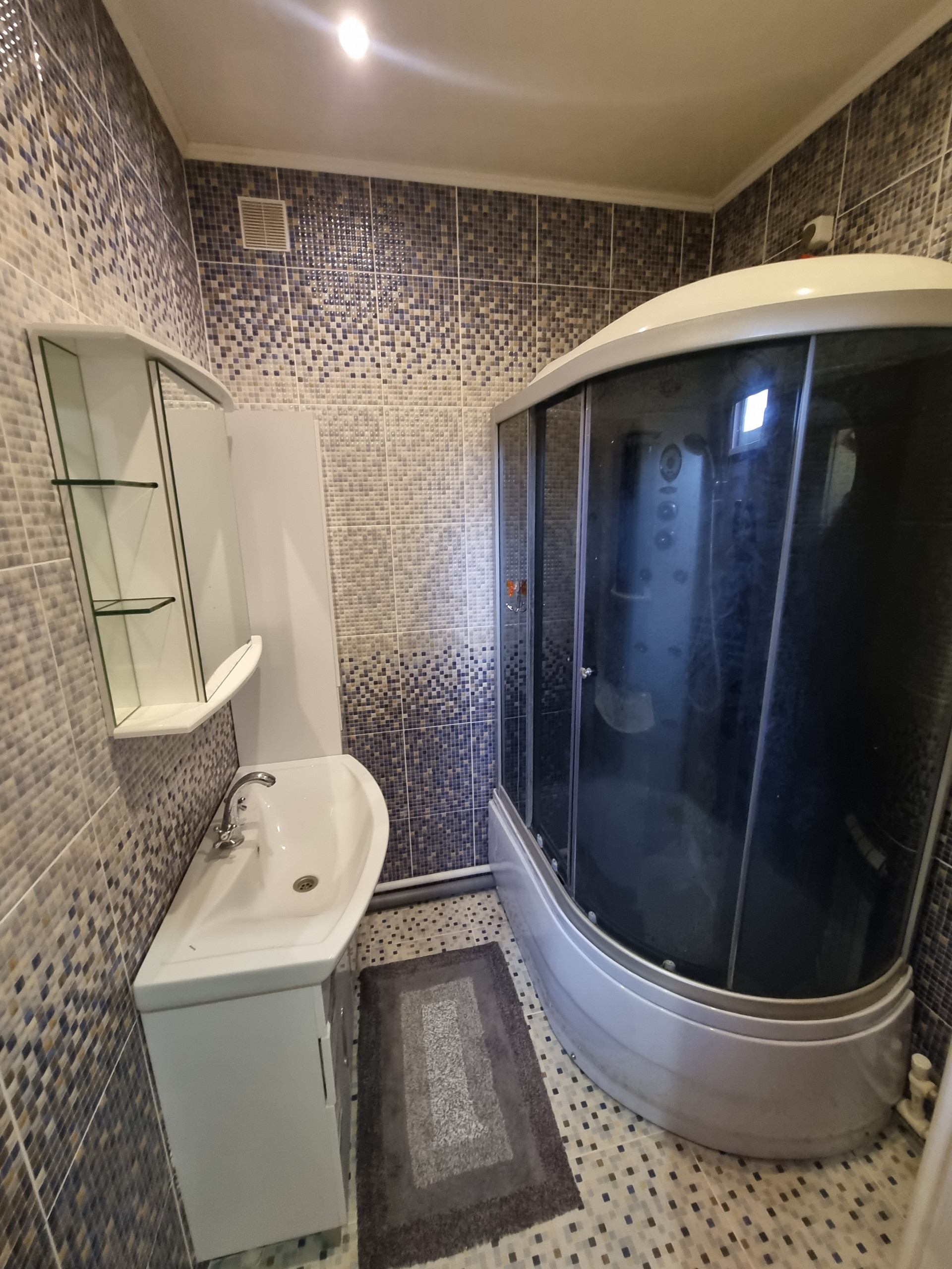 -В санузле на стенах выложена керамическая плитка, душевая кабина.